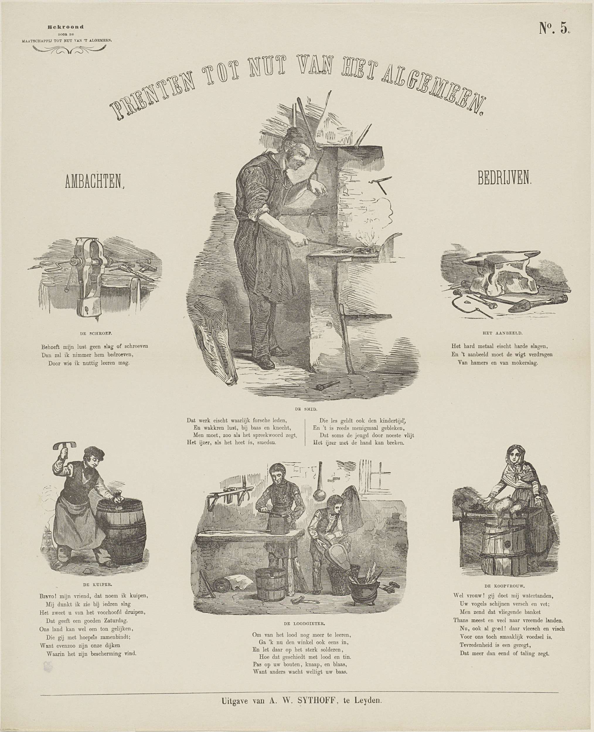 Blad met 6 voorstellingen van een schroefbank, een smid, een aambeeld, een kuiper een loodgieter en een koopvrouw. Onder elke voorstelling een titel en een vers. Genummerd rechtsboven: No. 5. Linksboven: Bekroond door de Maatschappij tot Nut van 't Algemeen.