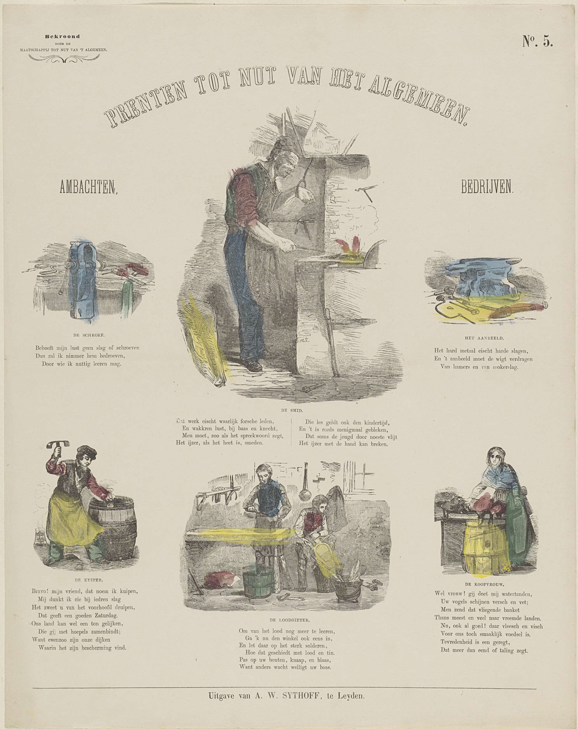Blad met 6 voorstellingen van een schroefbank, een smid, een aambeeld, een kuiper een loodgieter en een koopvrouw. Onder elke voorstelling een titel en een vers. Genummerd rechtsboven: No. 5. Linksboven: Bekroond door de Maatschappij tot Nut van 't Algemeen.