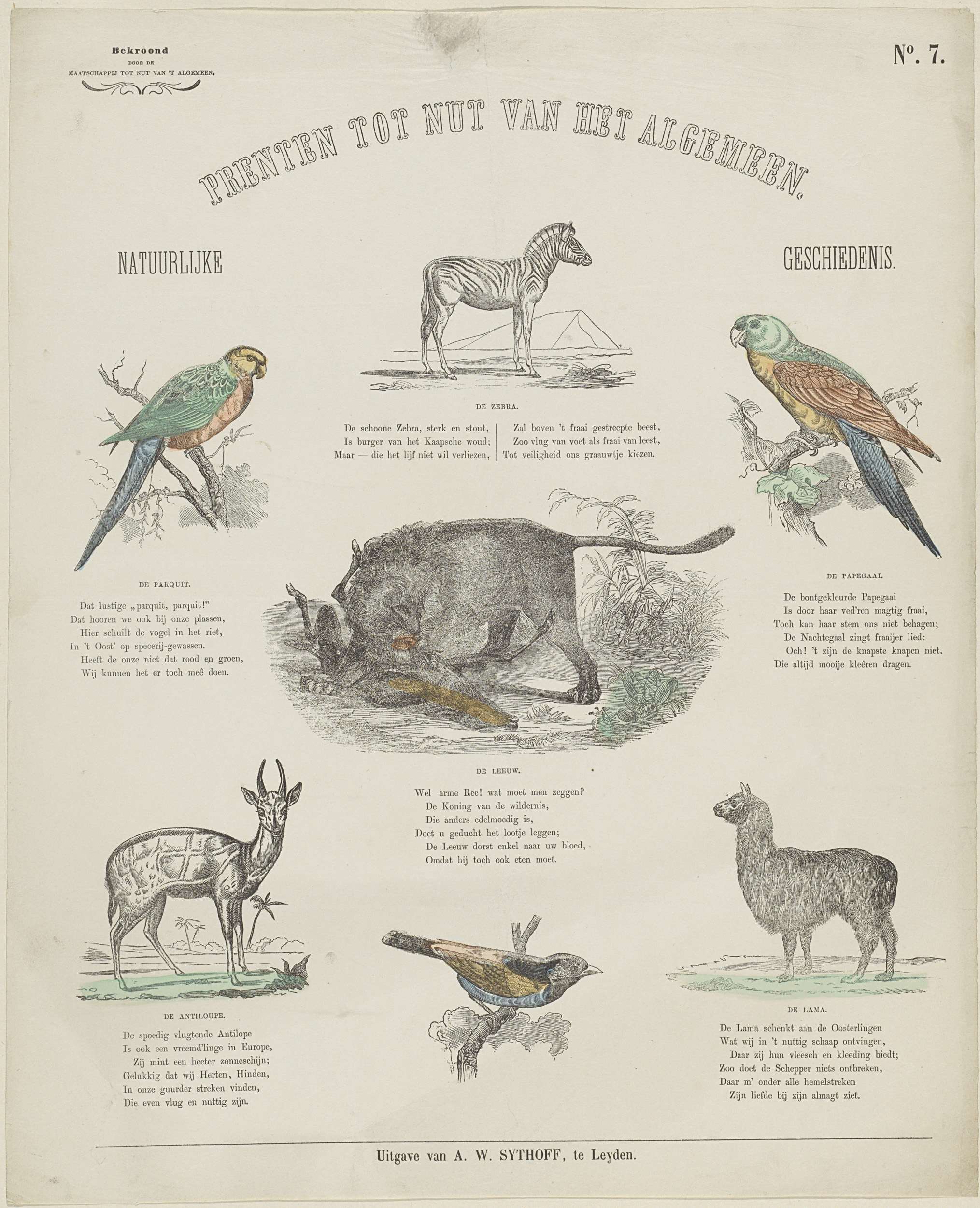 Blad met 7 voorstellingen van dieren, zoals een parkiet, een zebra en een leeuw. Onder enkele voorstellingen een titel en een vers. Genummerd rechtsboven: No. 7. Linksboven: Bekroond door de Maatschappij tot Nut van 't Algemeen.