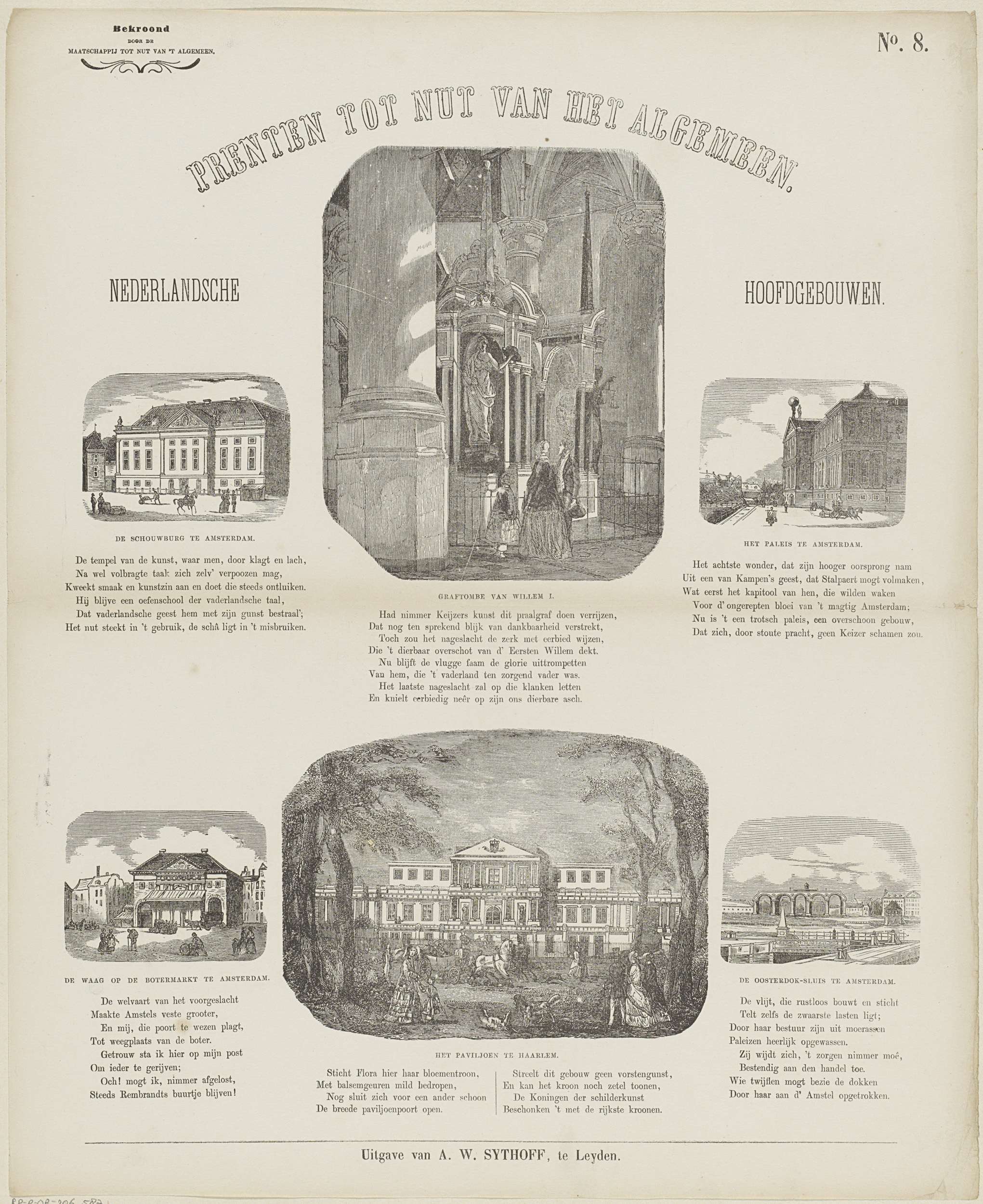 Blad met 6 voorstellingen van gebouwen en monumenten in Nederland, zoals de Schouwburg in Amsterdam en het grafmonument van Willem I. Onder elke voorstelling een titel en een vers. Genummerd rechtsboven: No. 8. Linksboven: Bekroond door de Maatschappij tot Nut van 't Algemeen.