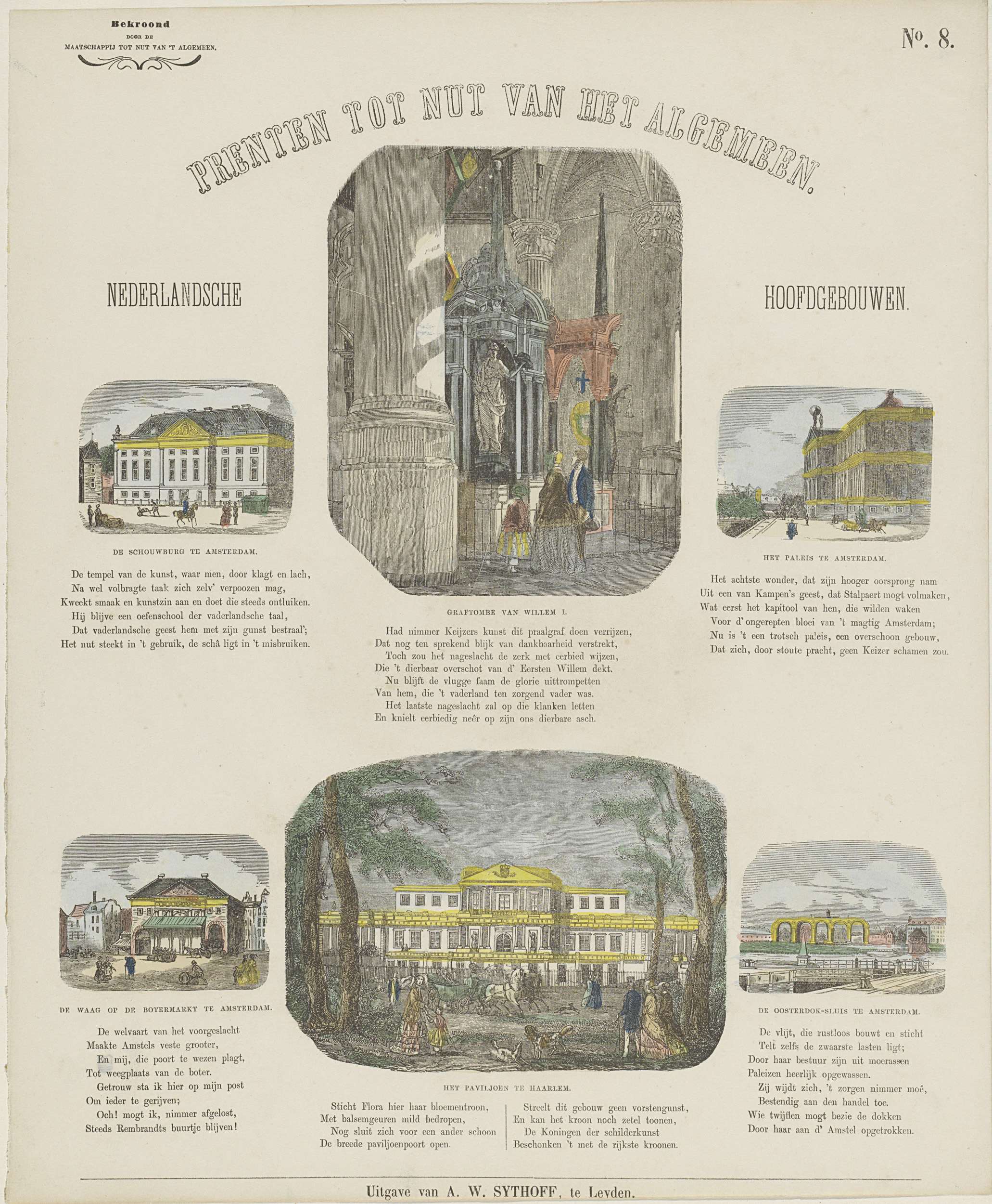 Blad met 6 voorstellingen van gebouwen en monumenten in Nederland, zoals de Schouwburg in Amsterdam en het grafmonument van Willem I. Onder elke voorstelling een titel en een vers. Genummerd rechtsboven: No. 8. Linksboven: Bekroond door de Maatschappij tot Nut van 't Algemeen.