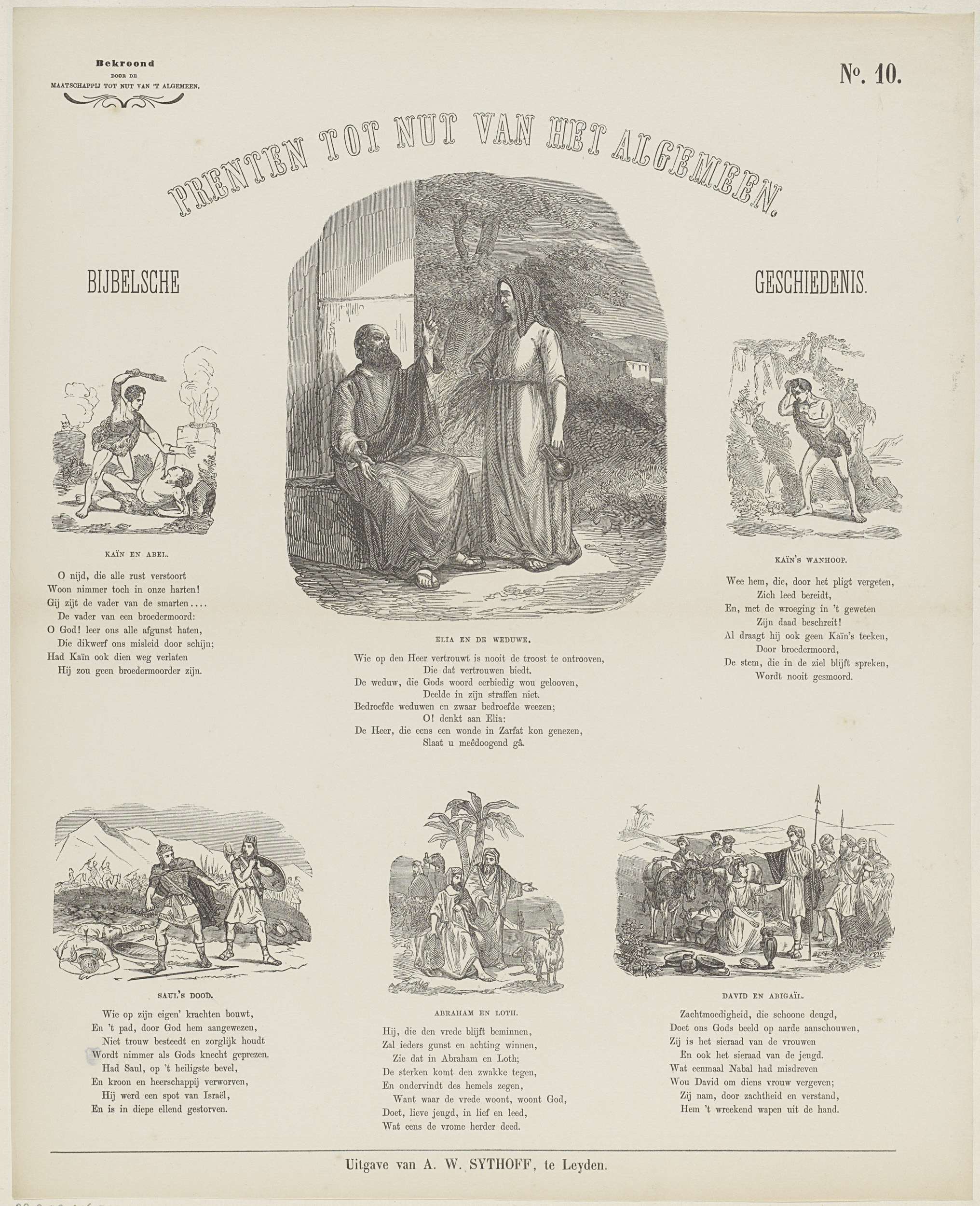 Blad met 6 voorstellingen uit het Oude Testament. Onder elke voorstelling een verwijzing naar een bijbeltekst en een vers. Genummerd rechtsboven: No. 10. Linksboven: Bekroond door de Maatschappij tot Nut van 't Algemeen.