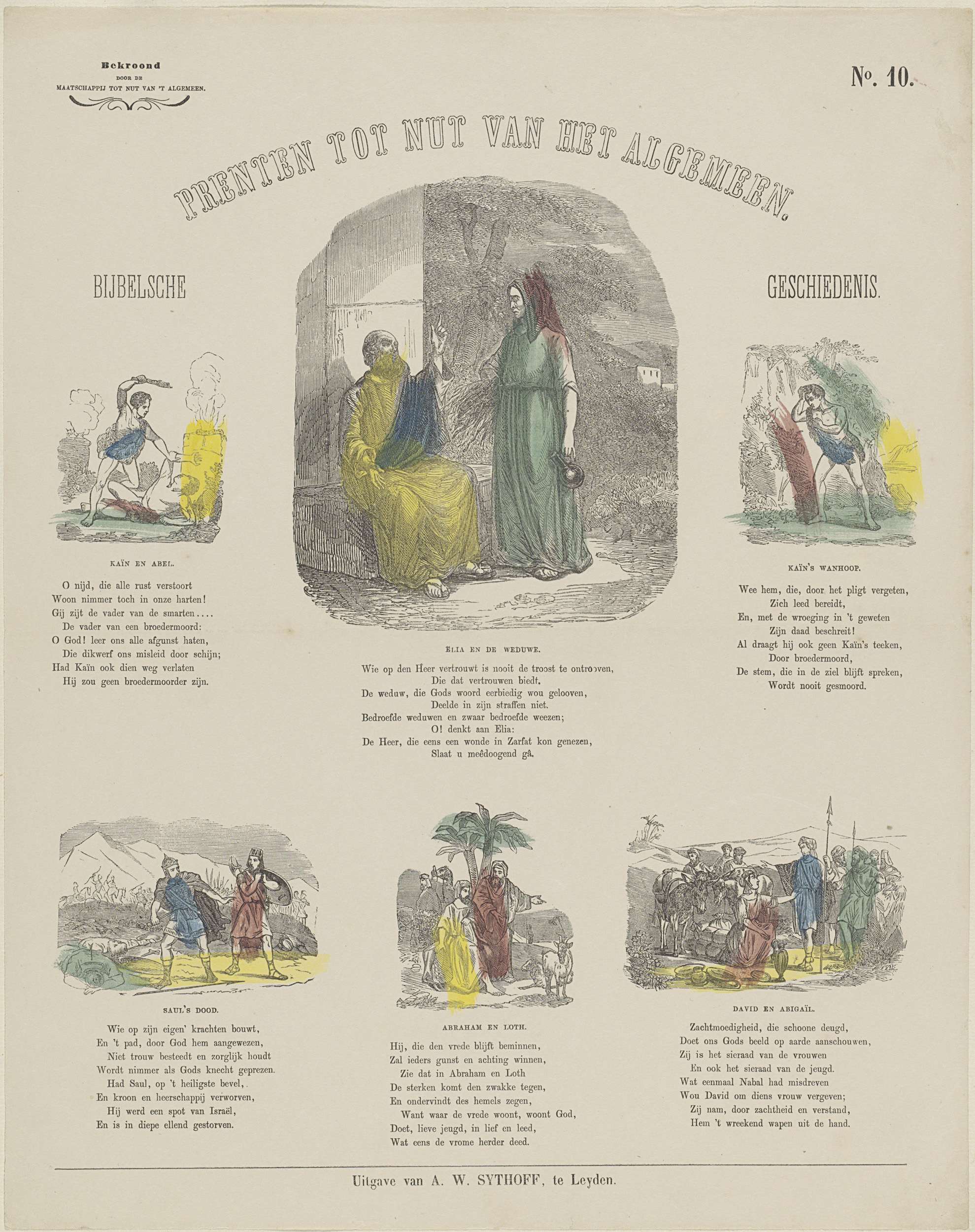 Blad met 6 voorstellingen uit het Oude Testament. Onder elke voorstelling een verwijzing naar een bijbeltekst en een vers. Genummerd rechtsboven: No. 10. Linksboven: Bekroond door de Maatschappij tot Nut van 't Algemeen.