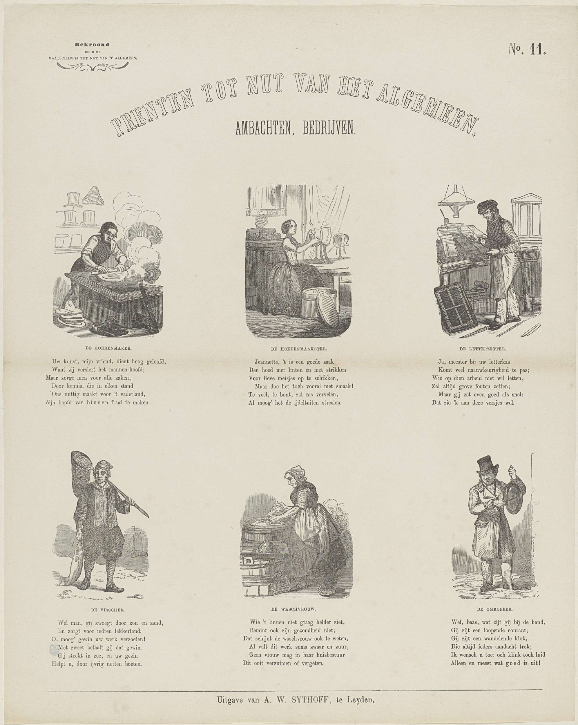 Blad met 6 voorstellingen van ambachtlieden en beroepen, zoals een hoedenmaker, een letterzetter, een visser en een omroeper. Onder elke afbeelding een titel en een vers. Genummerd rechtsboven: No. 11. Linksboven: Bekroond door de Maatschappij tot Nut van 't Algemeen.