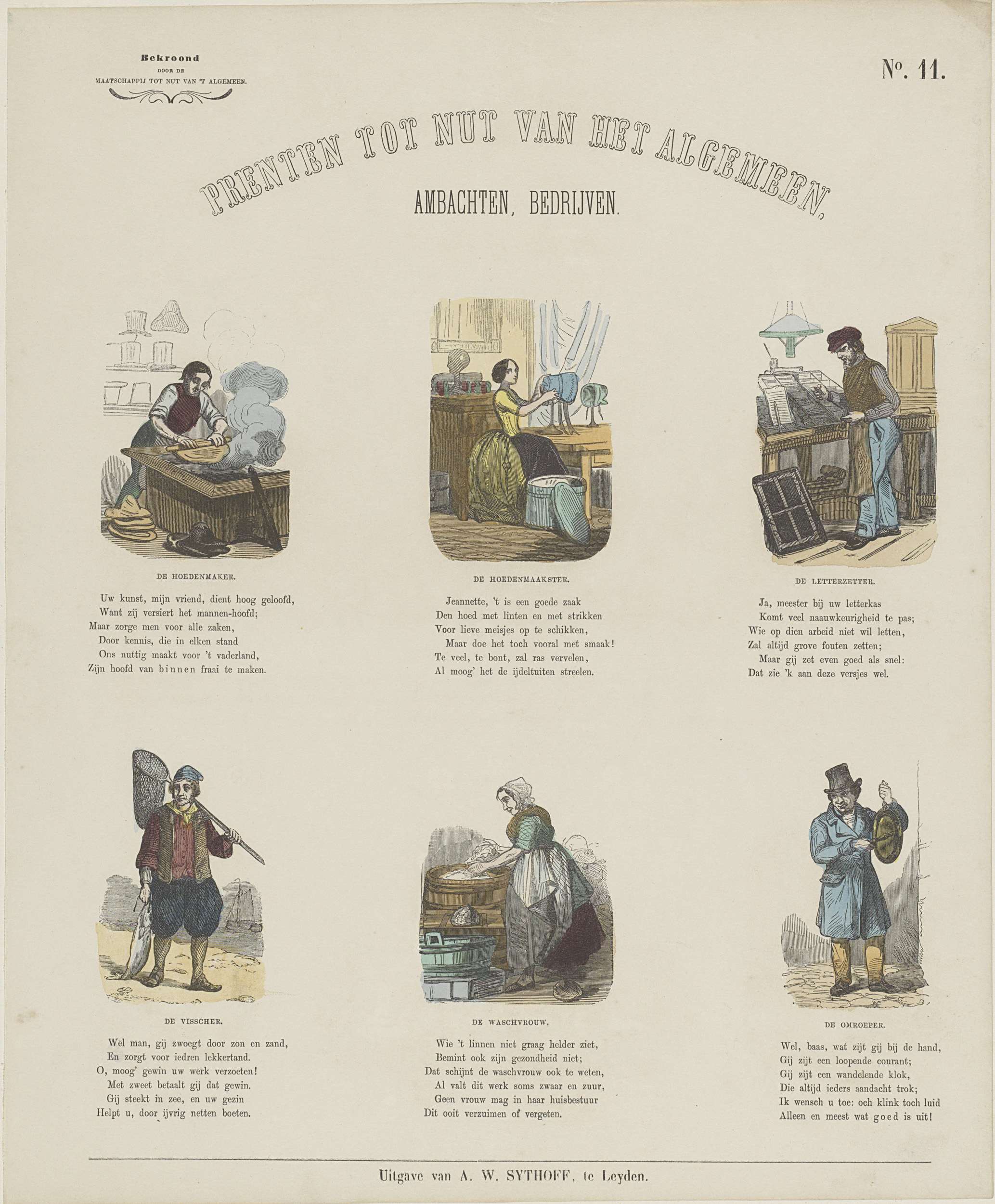 Blad met 6 voorstellingen van ambachtlieden en beroepen, zoals een hoedenmaker, een letterzetter, een visser en een omroeper. Onder elke afbeelding een titel en een vers. Genummerd rechtsboven: No. 11. Linksboven: Bekroond door de Maatschappij tot Nut van 't Algemeen.