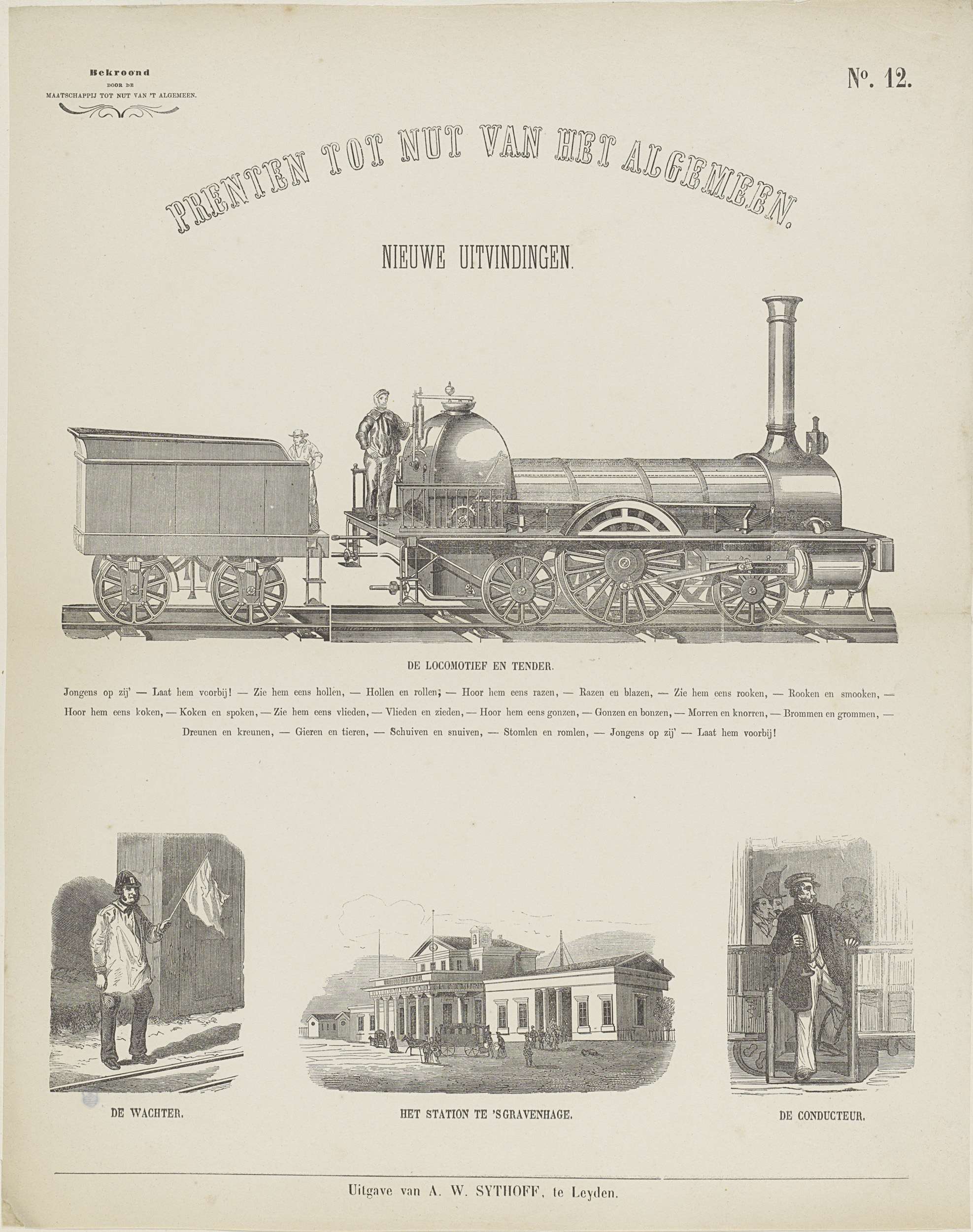 Blad met 4 voorstellingen van een locomotief, een wachter, het station van Den Haag en een conducteur. Onder elke afbeelding een titel. Onder de bovenste afbeelding een vers. Genummerd rechtsboven: No. 12. Linksboven: Bekroond door de Maatschappij tot Nut van 't Algemeen.