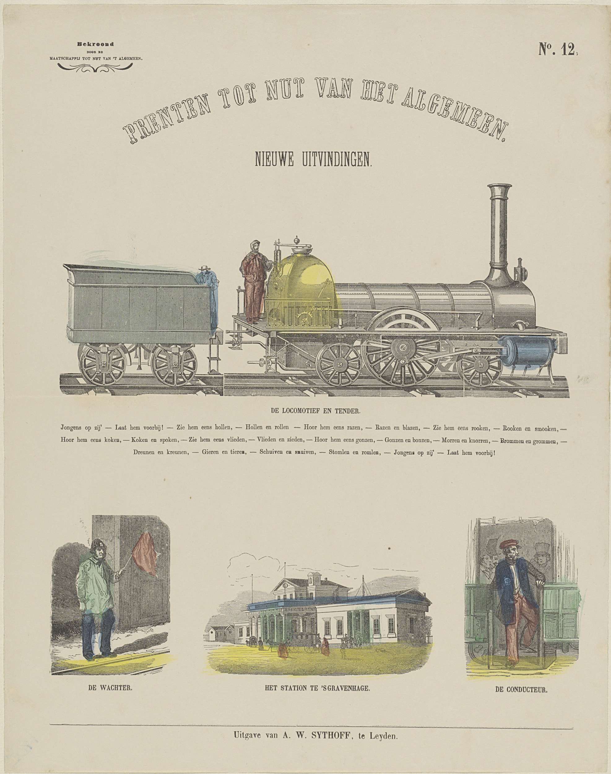 Blad met 4 voorstellingen van een locomotief, een wachter, het station van Den Haag en een conducteur. Onder elke afbeelding een titel. Onder de bovenste afbeelding een vers. Genummerd rechtsboven: No. 12. Linksboven: Bekroond door de Maatschappij tot Nut van 't Algemeen.