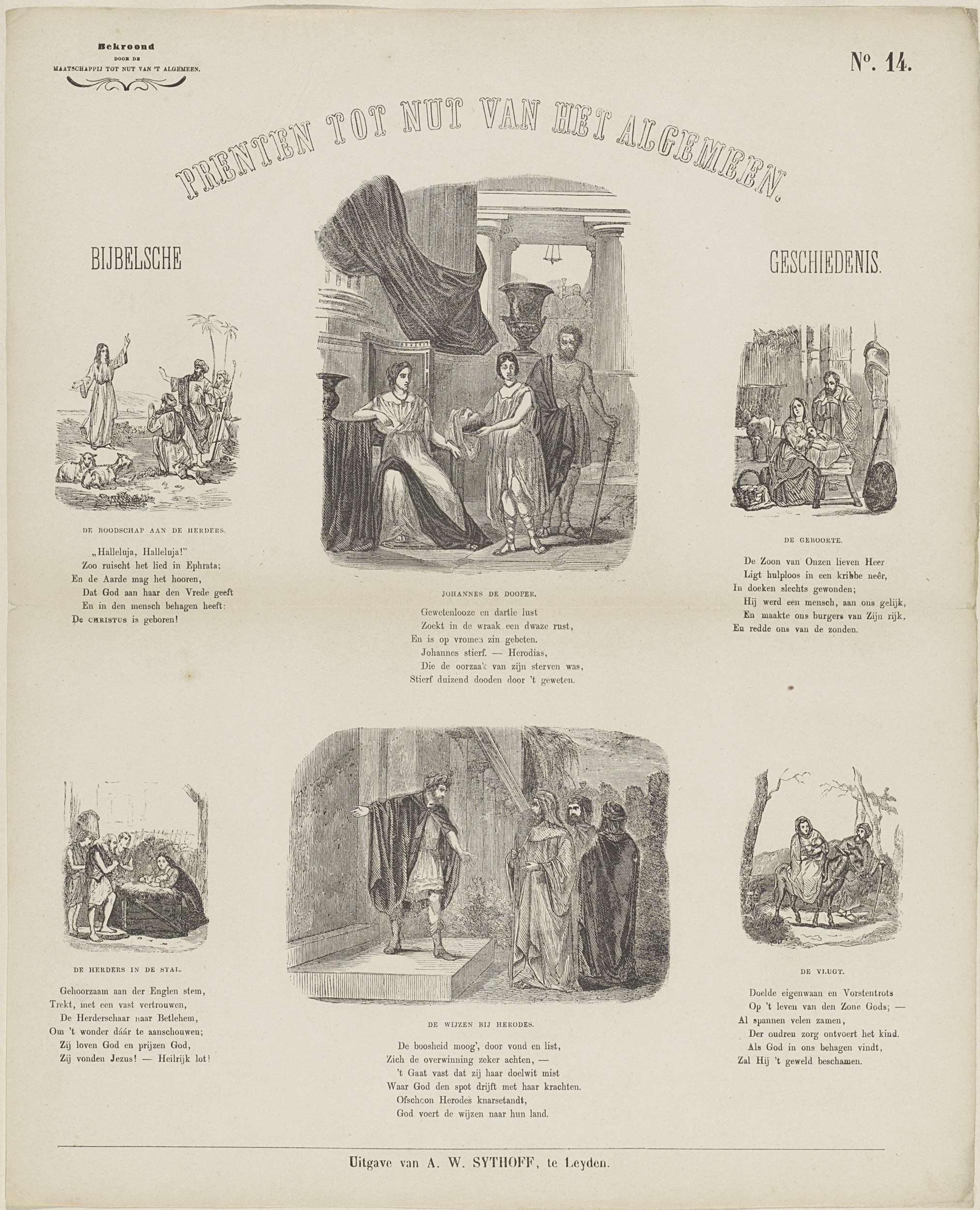 Blad met 6 voorstellingen uit het Nieuwe Testament. Onder elke afbeelding een titel en een vers. Genummerd rechtsboven: No. 14. Linksboven: Bekroond door de Maatschappij tot Nut van 't Algemeen.