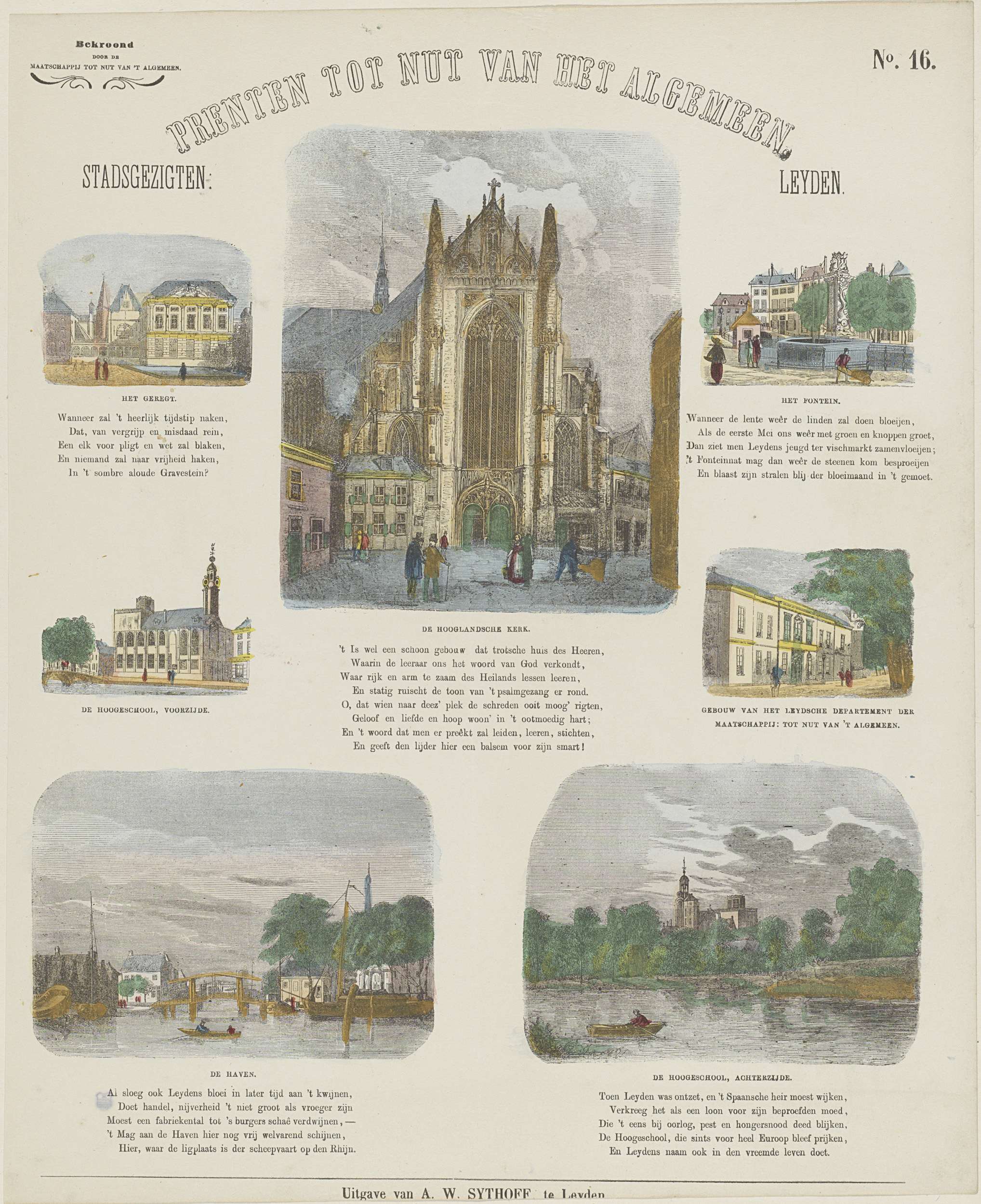 Blad met 7 verschillende gezichten op Leiden. Onder elke afbeelding een onderschrift. Genummerd rechtsboven: No. 16. Linksboven: Bekroond door de Maatschappij tot Nut van 't Algemeen.