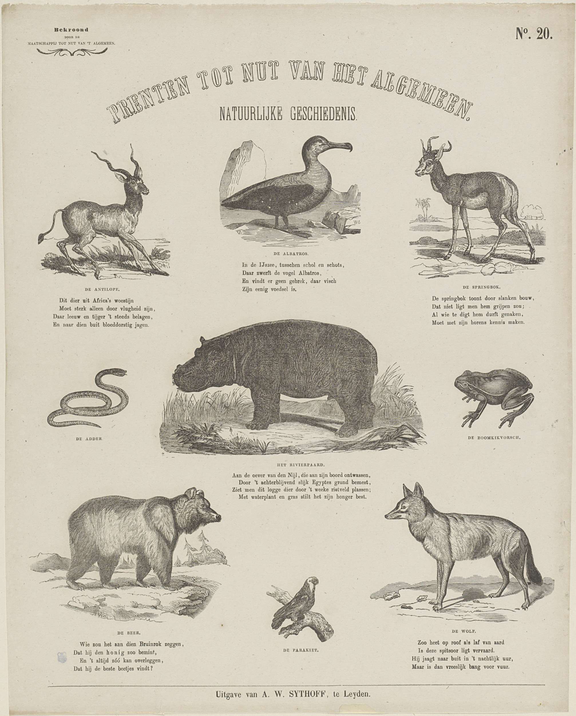 Blad met 9 voorstellingen van dieren, zoals een antilope, een springbok en een beer. Onder elke afbeelding een onderschrift. Genummerd rechtsboven: No. 20. Linksboven: Bekroond door de Maatschappij tot Nut van 't Algemeen.