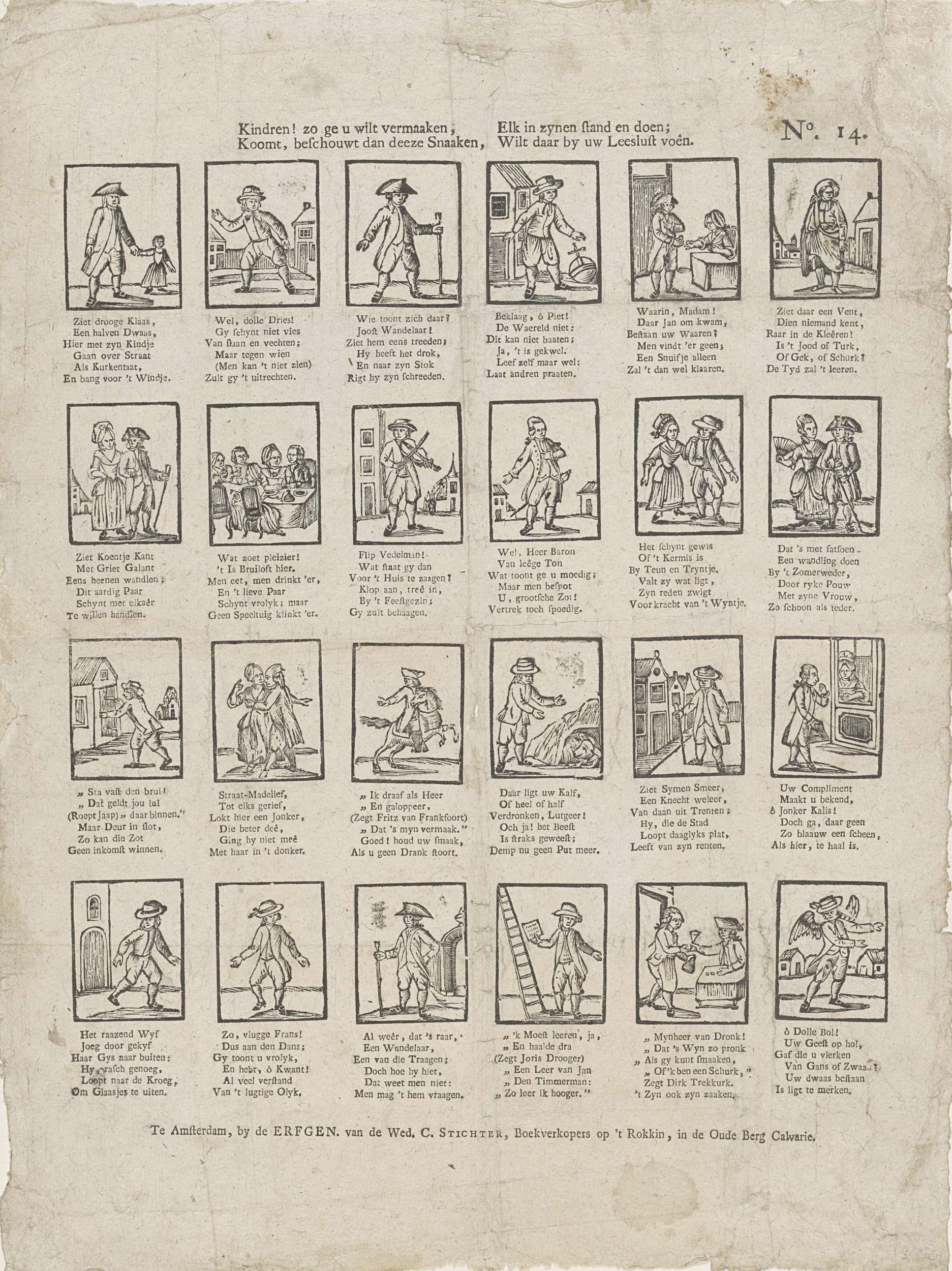 Blad met 24 voorstellingen van verschillende figuren. Onder elke afbeelding een zesregelig vers. Genummerd rechtsboven: No. 14.