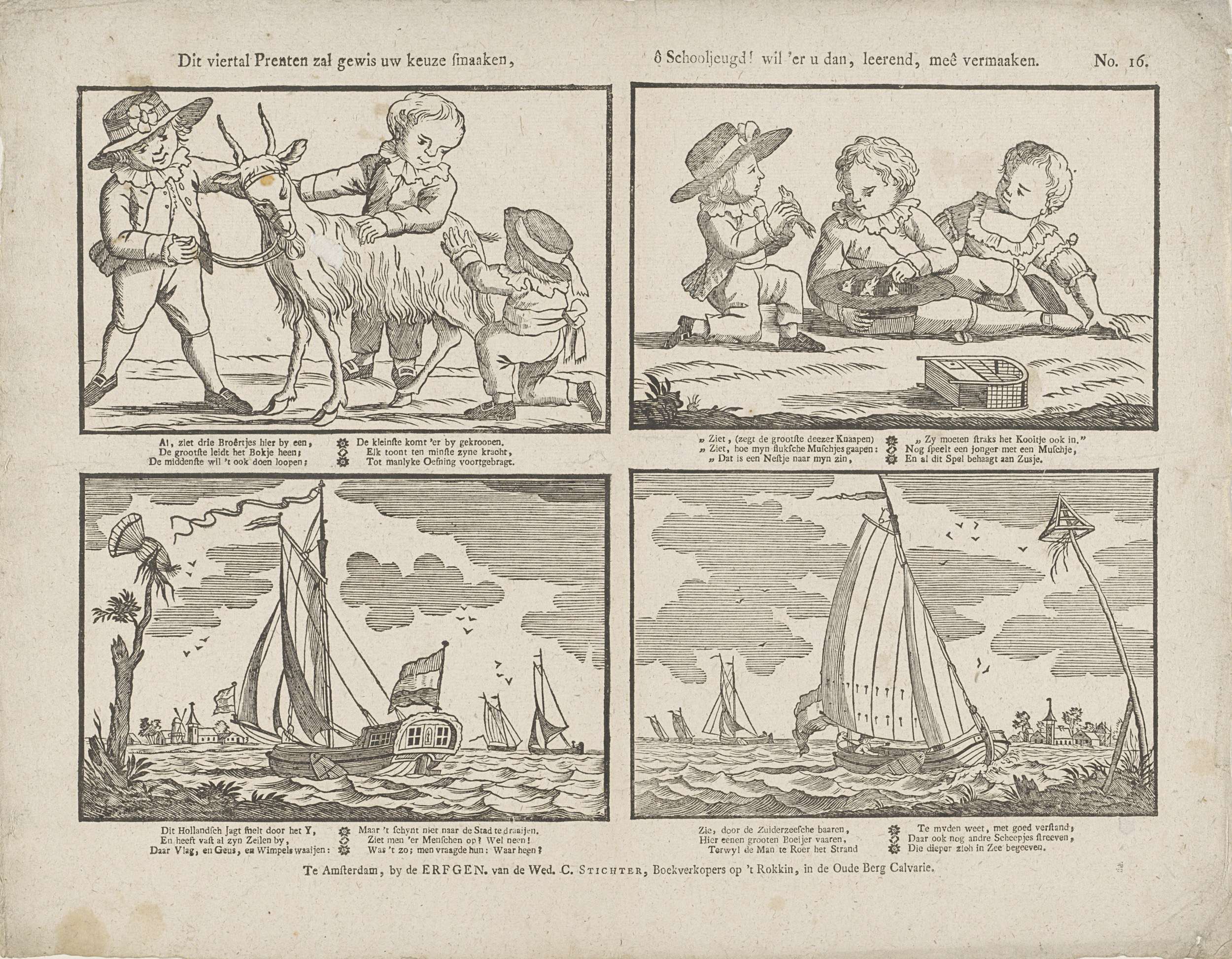 Blad met 4 voorstellingen van kinderen die spelen met dieren en van schepen. Onder elke afbeelding een vers in twee kolommen. Genummerd rechtsboven: No. 16.