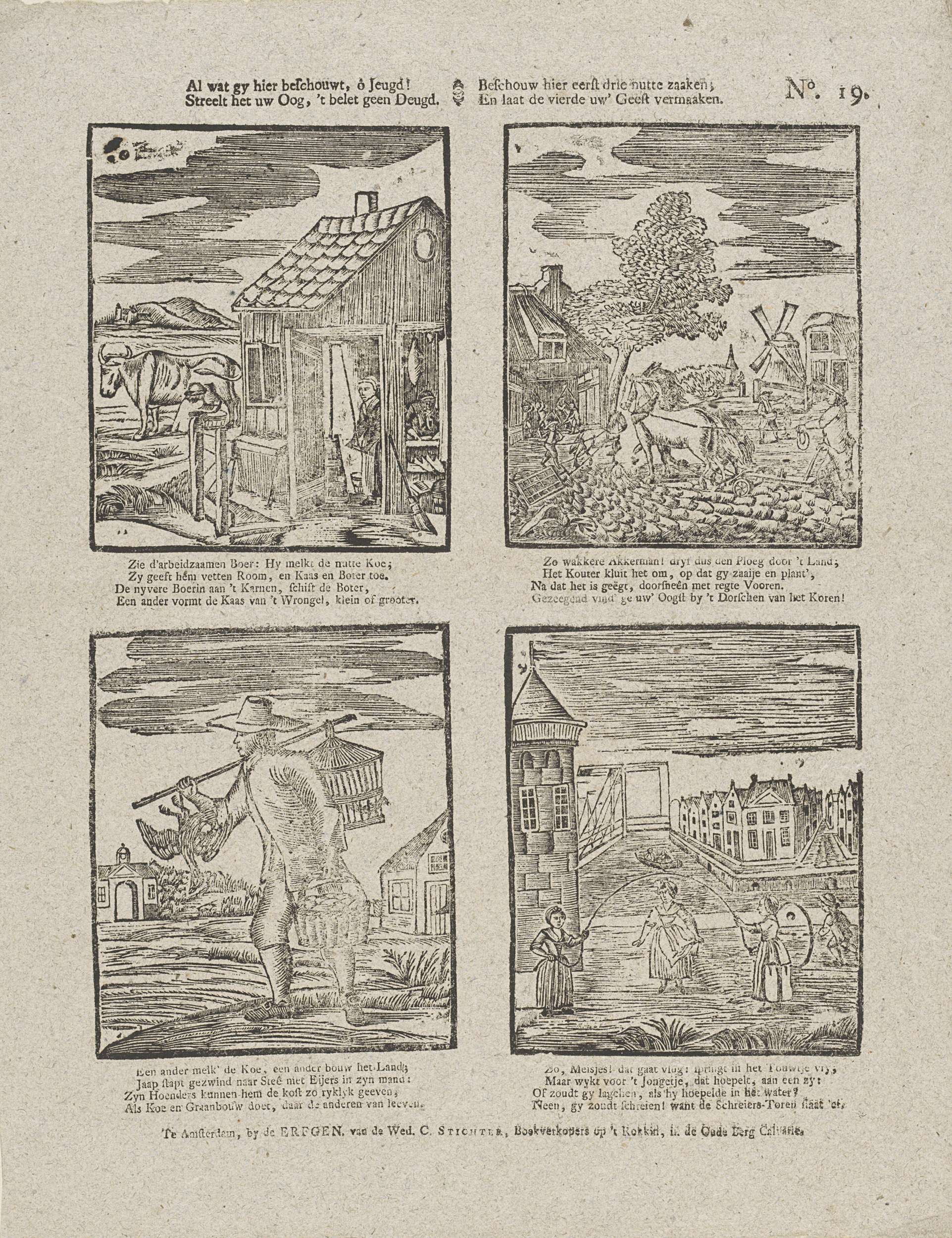 Blad met 4 voorstellingen van de wekzaamheden van een boer en van kinderen die touwtjespringen. Onder elke afbeelding een vierregelig vers. Genummerd rechtsboven: No. 19.