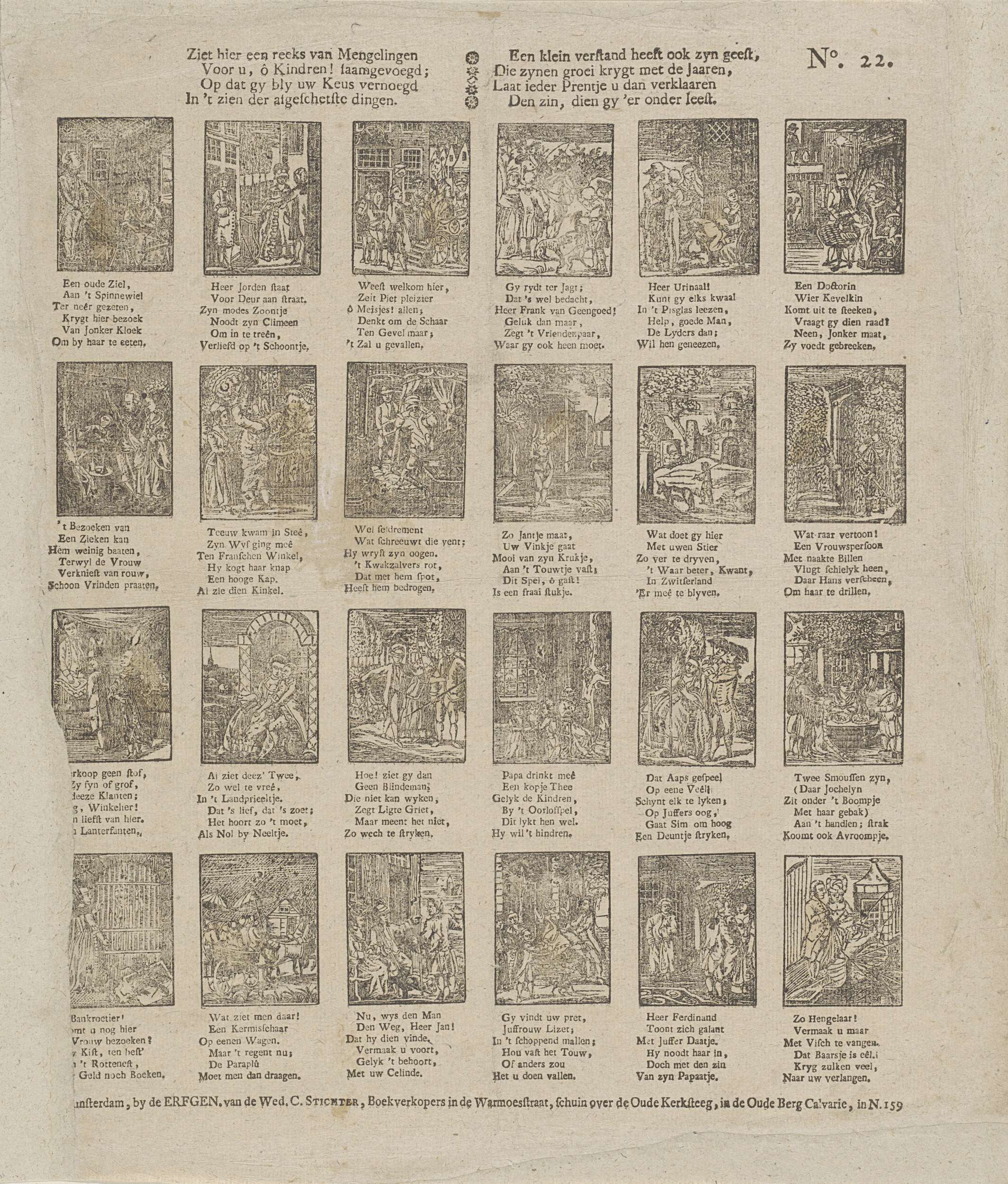 Blad met 24 voorstellingen van verschillende figuren en bezigheden. Onder elke afbeelding een zesregelig vers. Genummerd rechtsboven: No. 22.