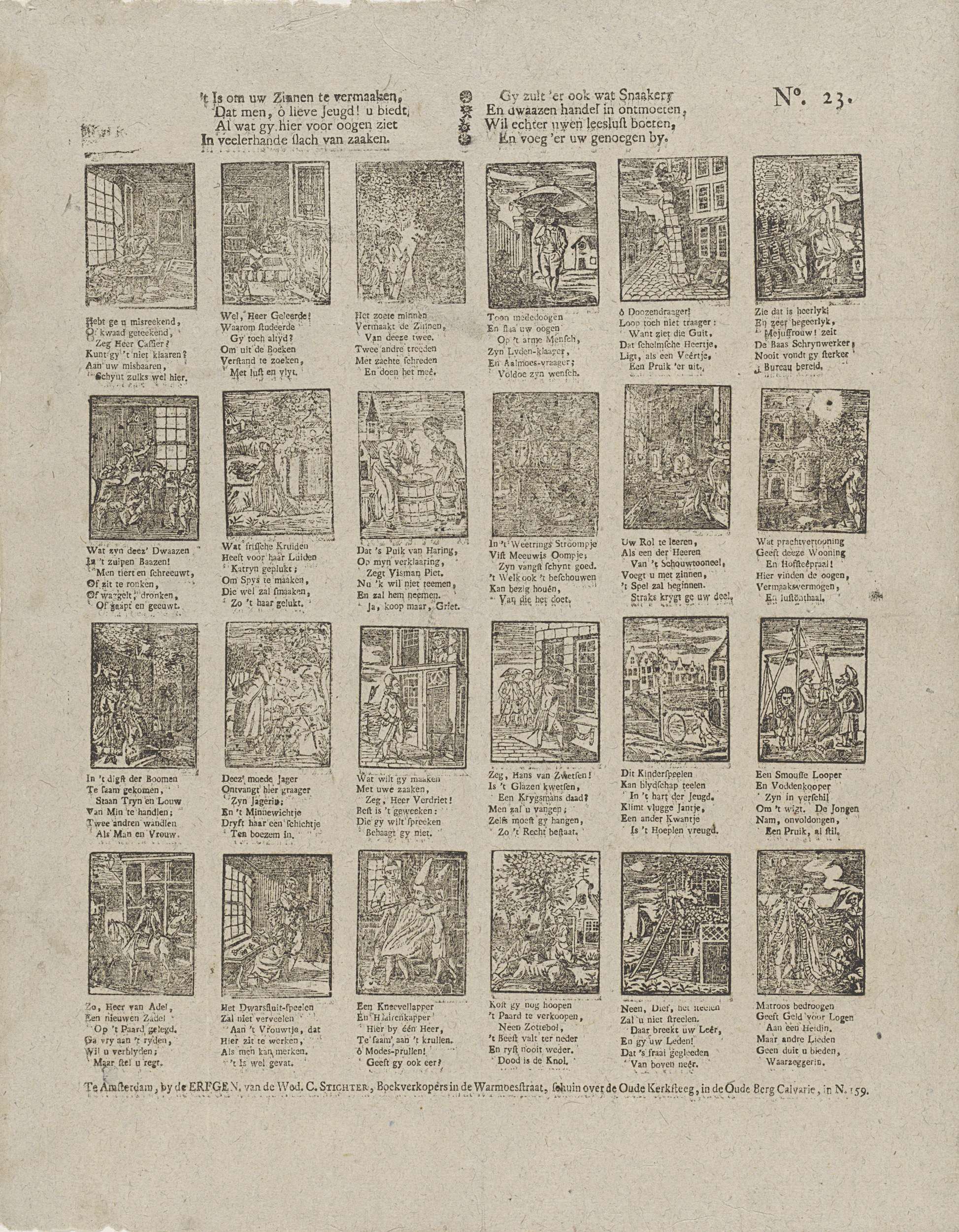 Blad met 24 voorstellingen van verschillende figuren en beroepen. Onder elke afbeelding een zesregelig vers. Genummerd rechtsboven: No. 23.