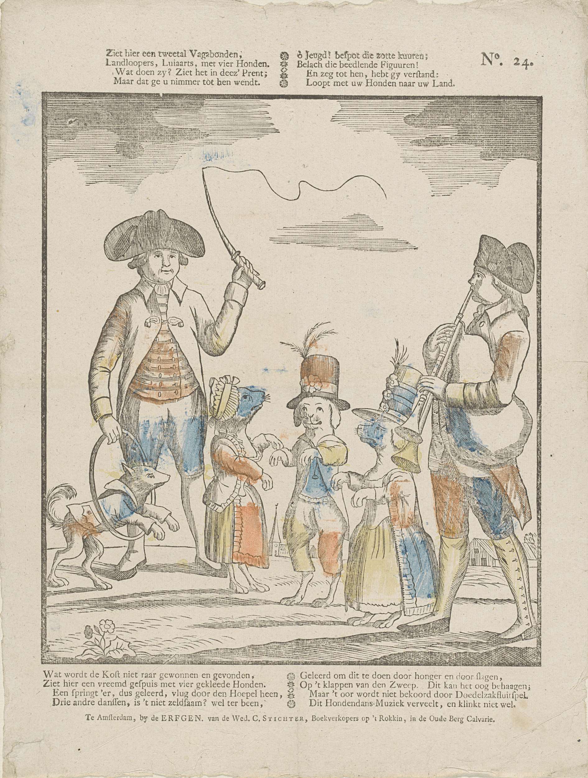 Blad met een grote voorstelling van twee mannen met vier honden. De honden doen kunstjes en dragen kleren. Onder de afbeelding een achtregelig vers in twee kolommen. Genummerd rechtsboven: No. 24.