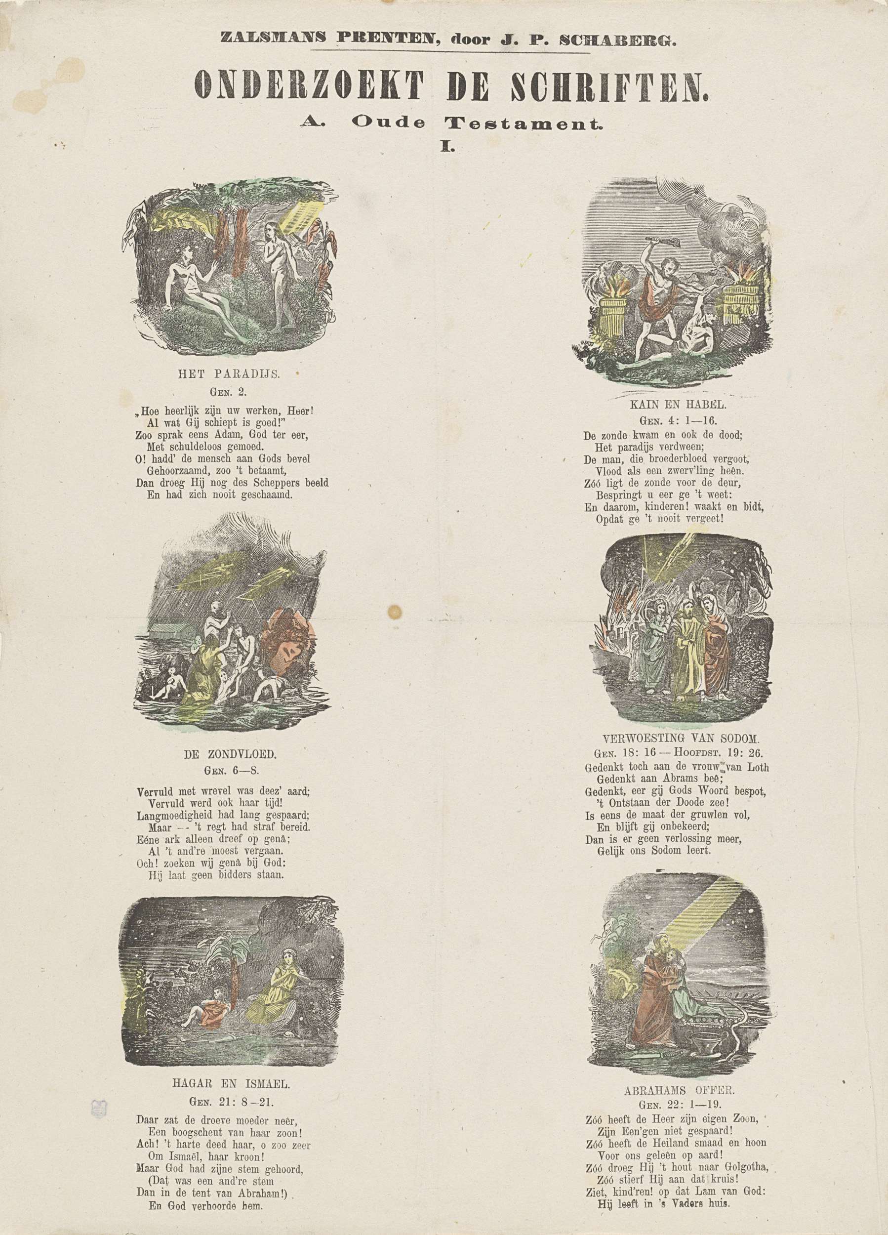 Blad met 6 voorstellingen van verhalen uit het Oude Testament. Onder elke voorstelling een achtregelig vers en een verwijzing naar de bijbehorende Bijbeltekst. Genummerd midden boven: I.