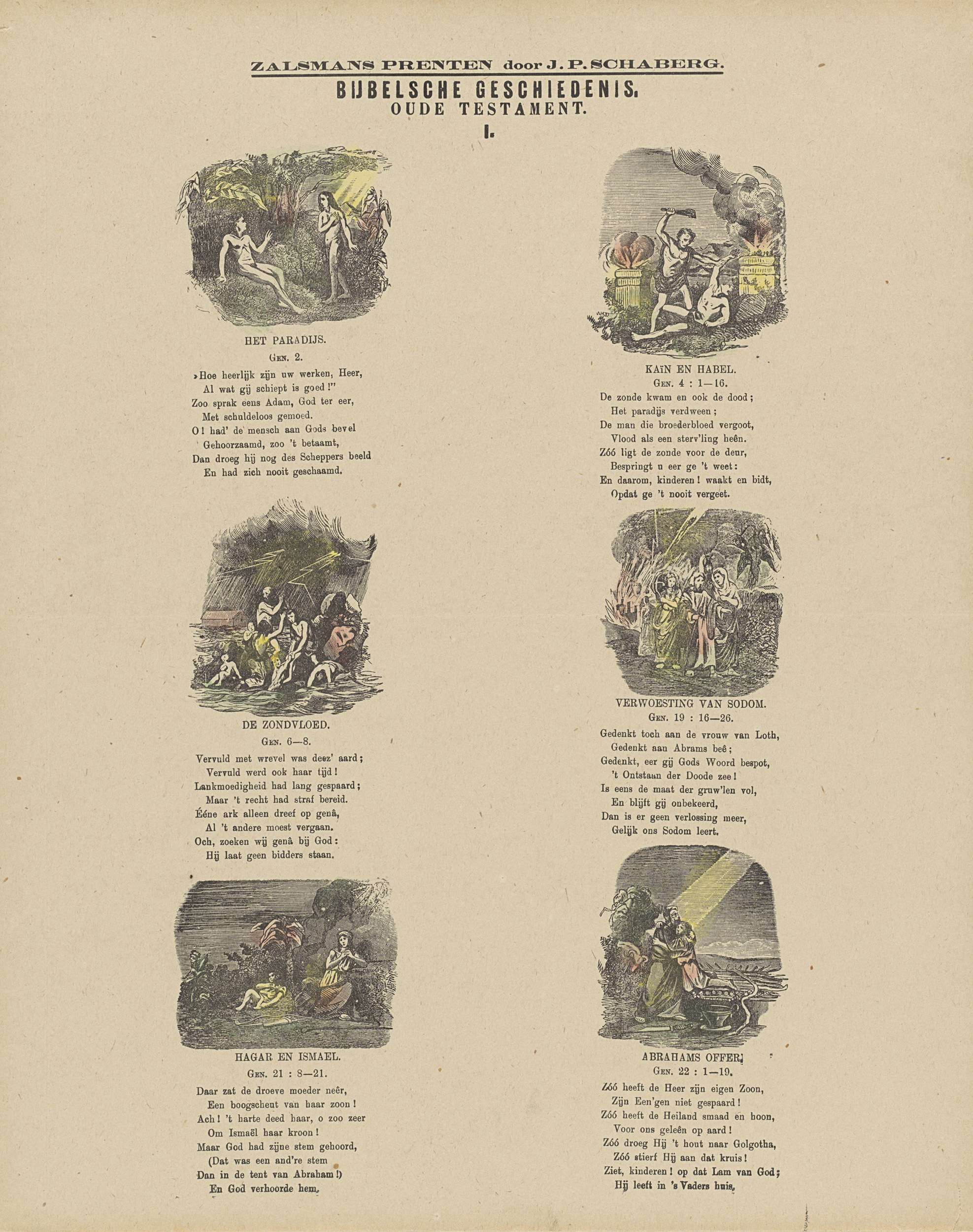Blad met 6 voorstellingen van verhalen uit het Oude Testament. Onder elke voorstelling een achtregelig vers en een verwijzing naar de bijbehorende Bijbeltekst. Genummerd midden boven: I.