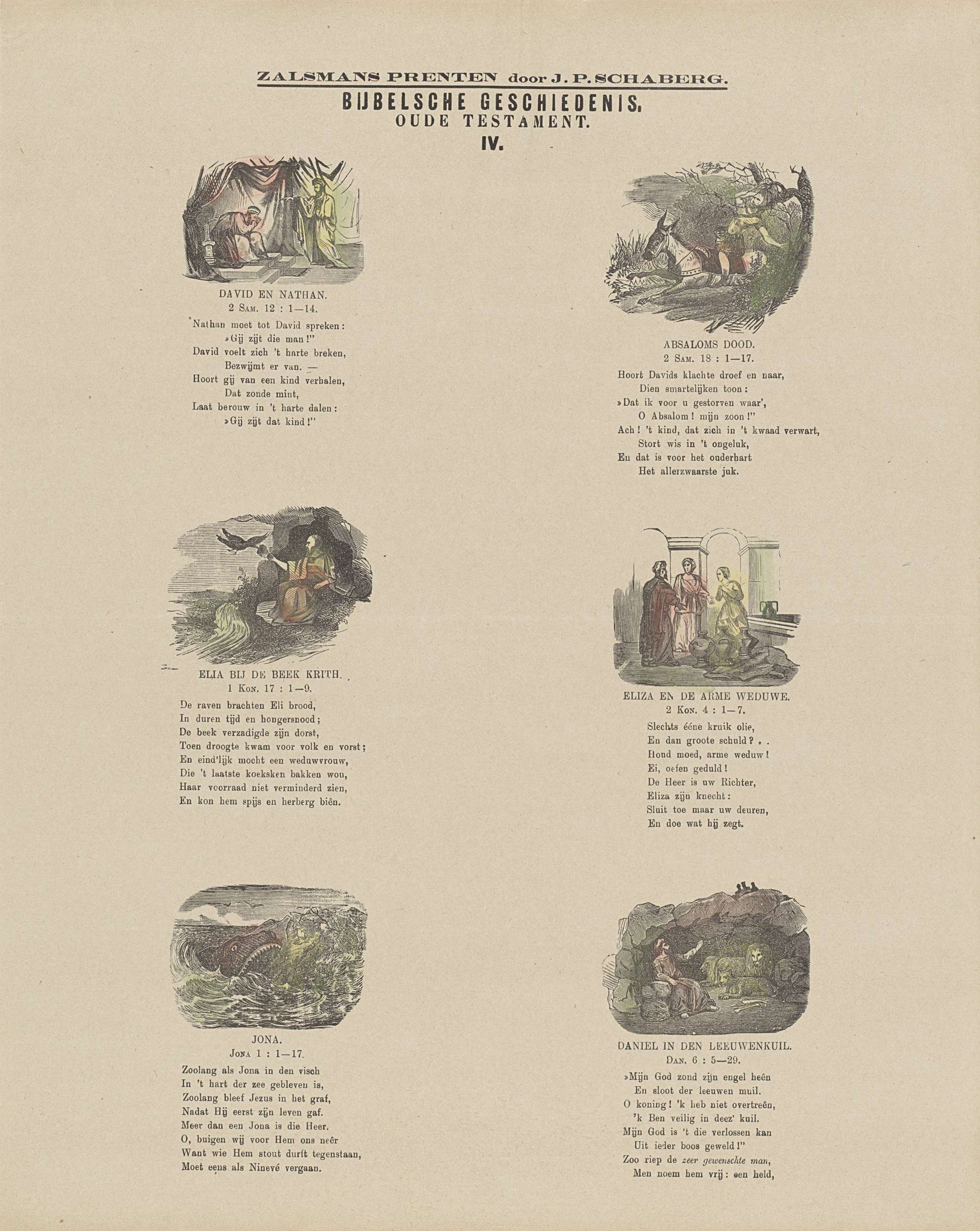 Blad met 6 voorstellingen van verhalen uit het Oude Testament. Onder elke voorstelling een achtregelig vers en een verwijzing naar de bijbehorende Bijbeltekst. Genummerd midden boven: IV.