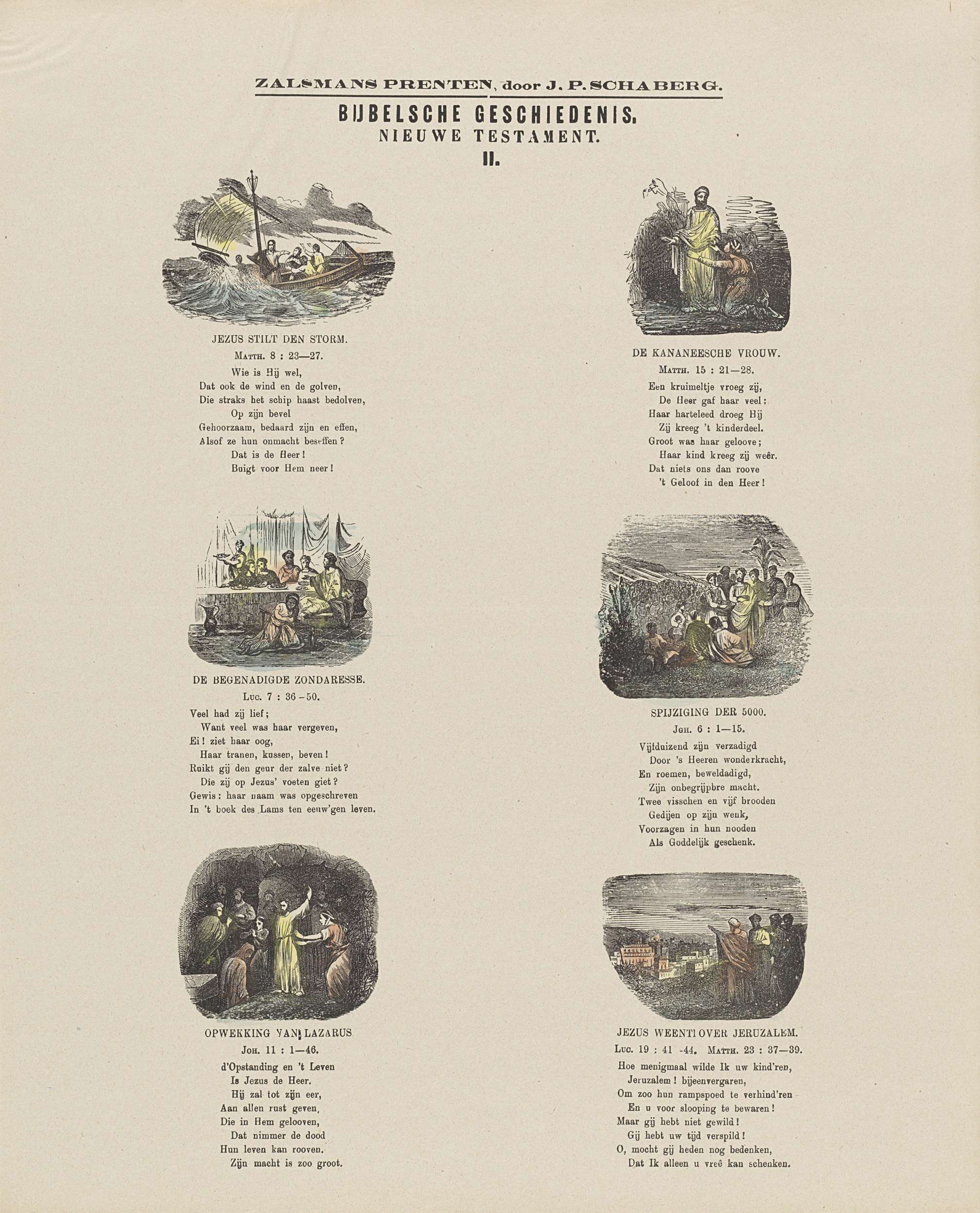 Blad met 6 voorstellingen van verhalen uit het Nieuwe Testament. Onder elke voorstelling een achtregelig vers en een verwijzing naar de bijbehorende Bijbeltekst. Genummerd midden boven: II.