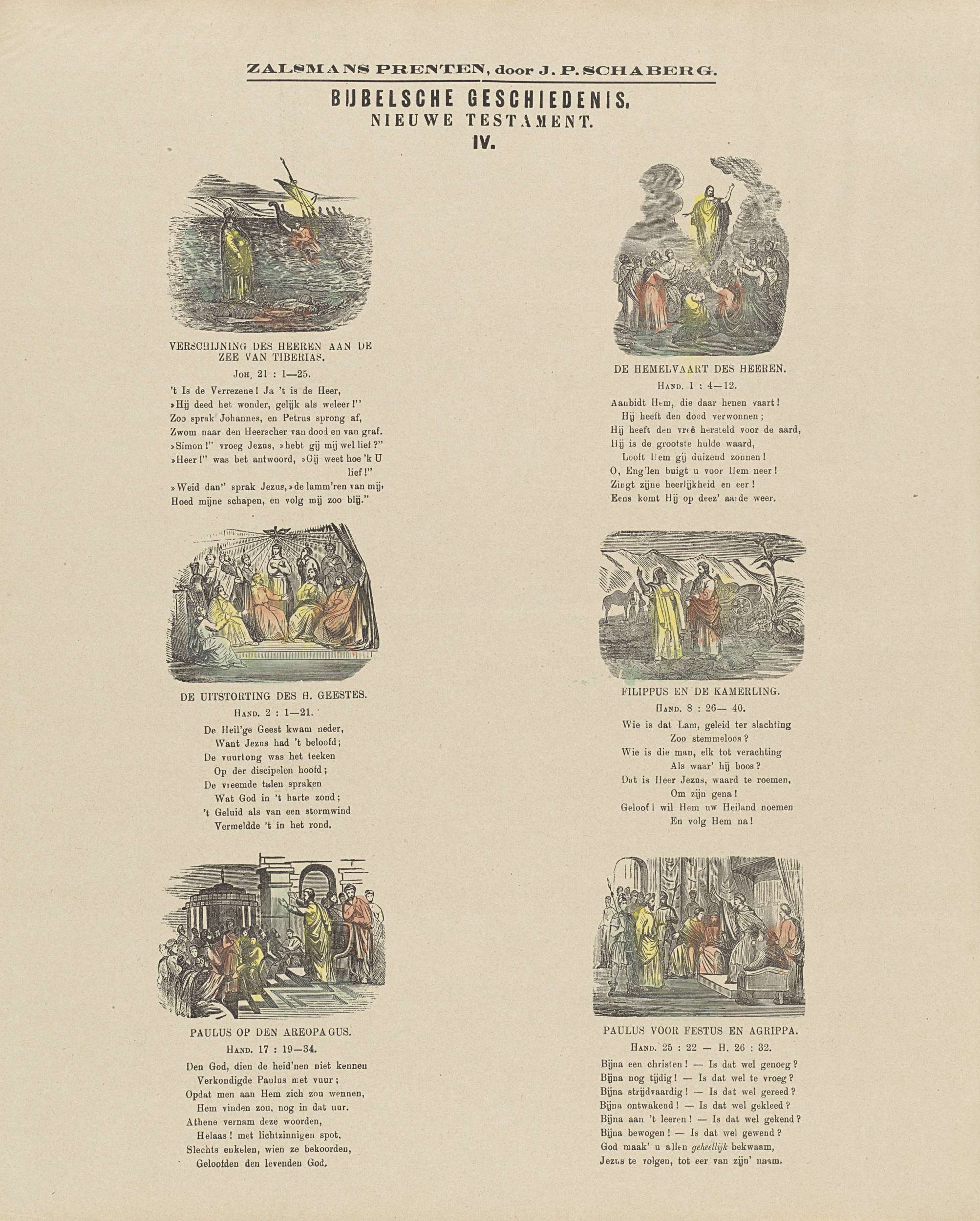 Blad met 6 voorstellingen van verhalen uit het Nieuwe Testament. Onder elke voorstelling een achtregelig vers en een verwijzing naar de bijbehorende Bijbeltekst. Genummerd midden boven: IV.