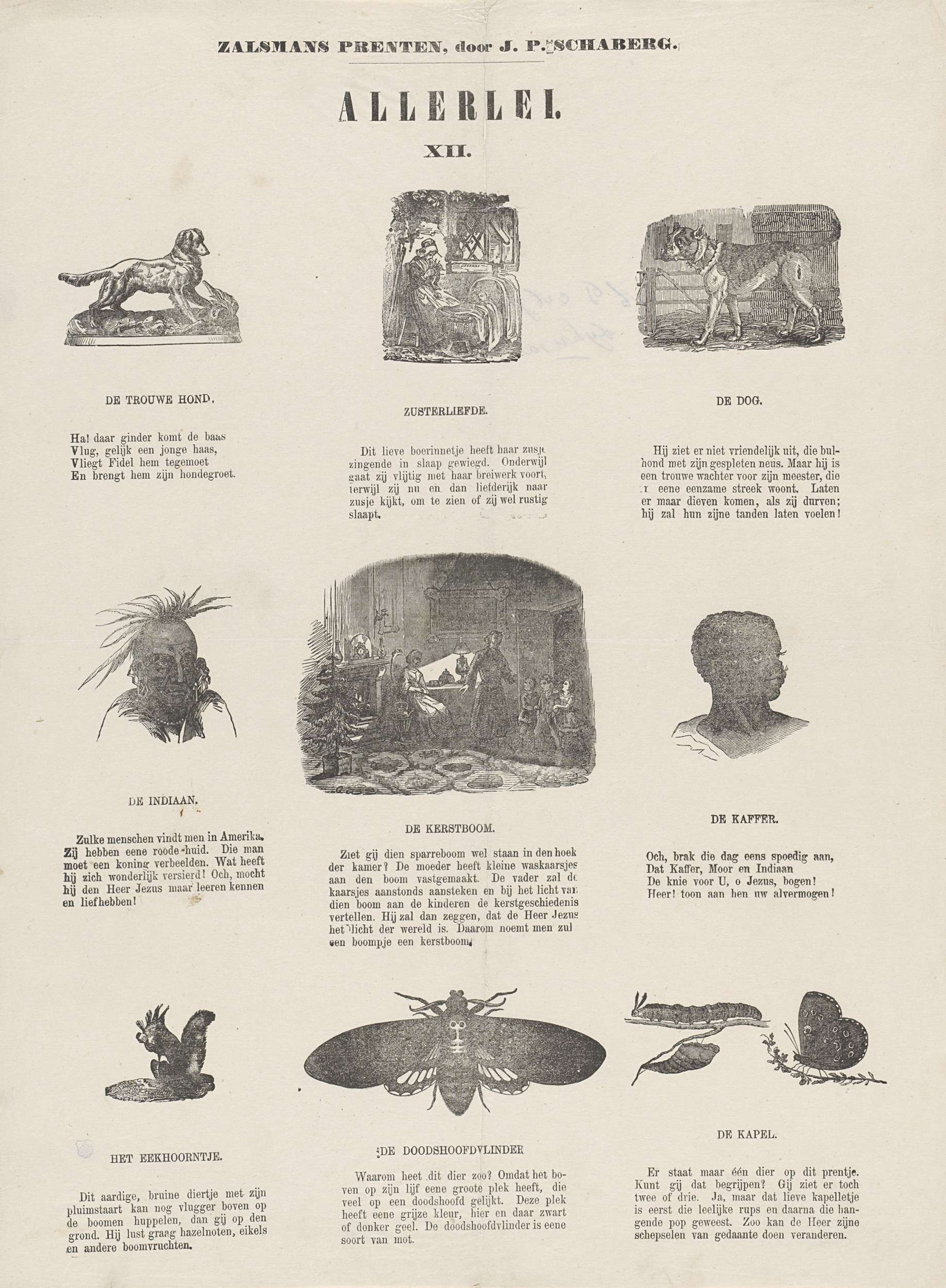 Blad met negen voorstellingen van mensen en dieren, zoals een eekhoorn, een oorspronkelijke Noord-Amerikaan en zusterliefde. Onder elke voorstelling een onderschrift. Genummerd midden boven: XII.