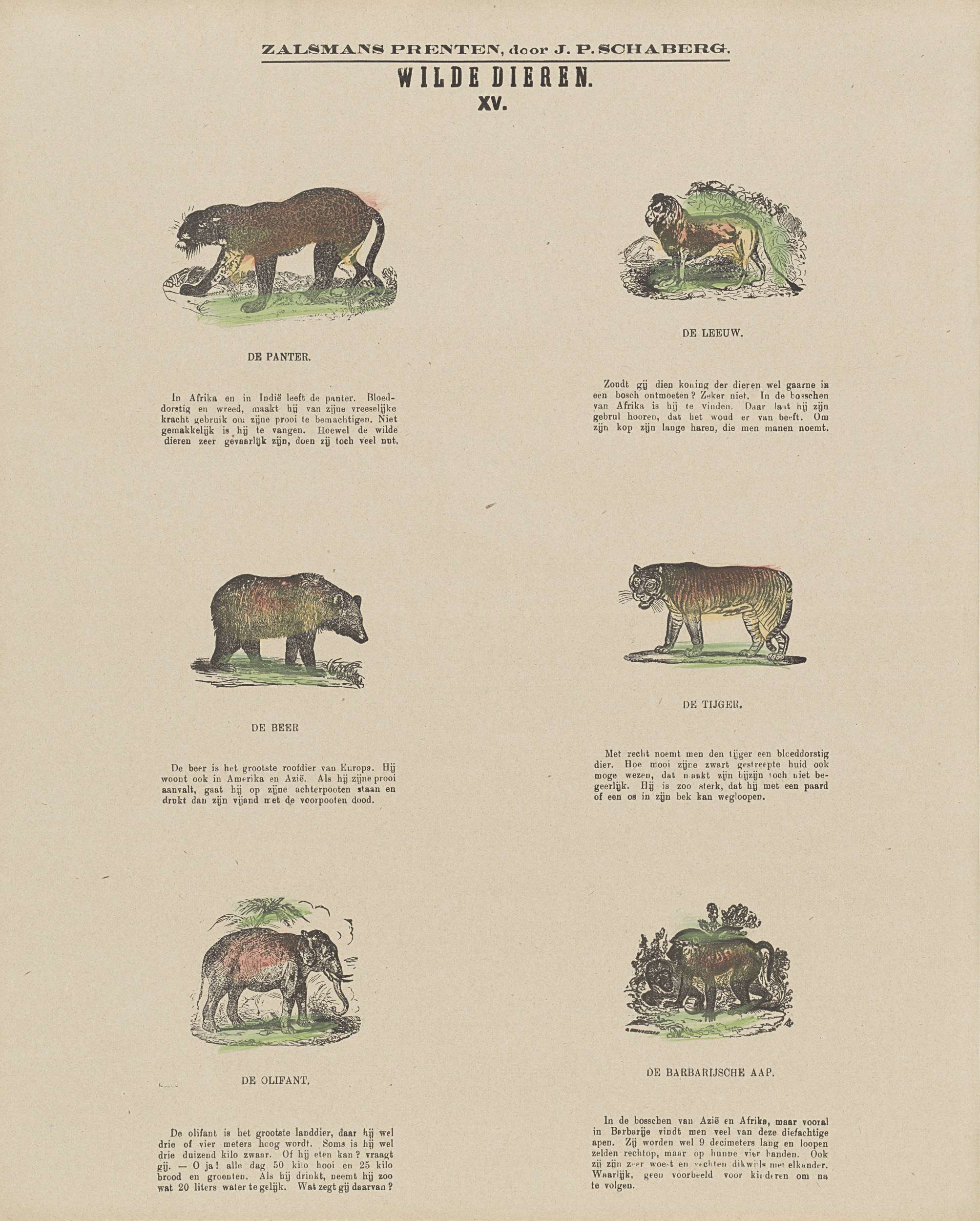 Blad met 6 voorstellingen van dieren, zoals een panter, een leeuw en een beer. Onder elke voorstelling een onderschrift. Genummerd midden boven: XV.