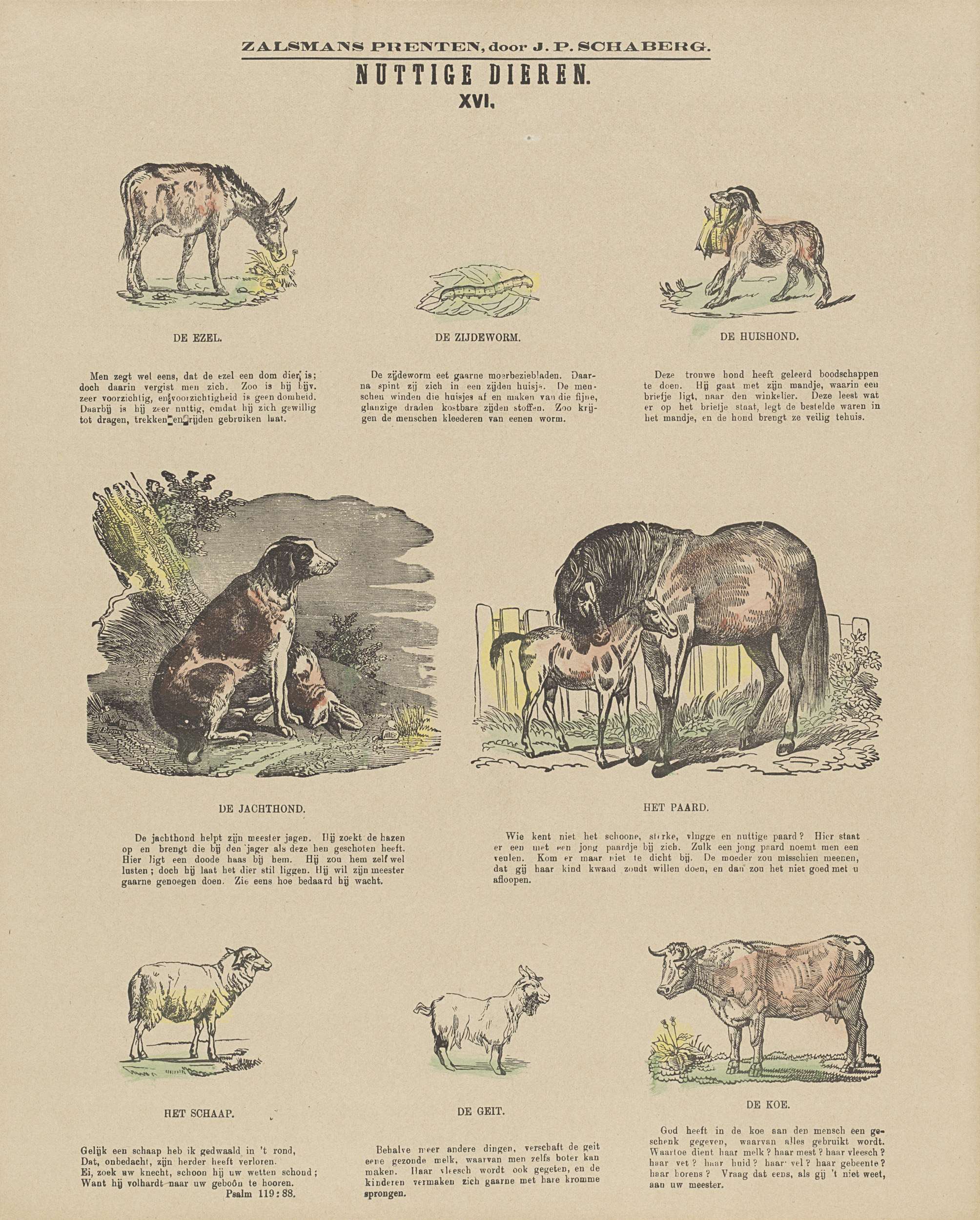Blad met 8 voorstellingen van dieren, zoals een ezel, een hond en een geit. Onder elke voorstelling een onderschrift. Genummerd midden boven: XVI.