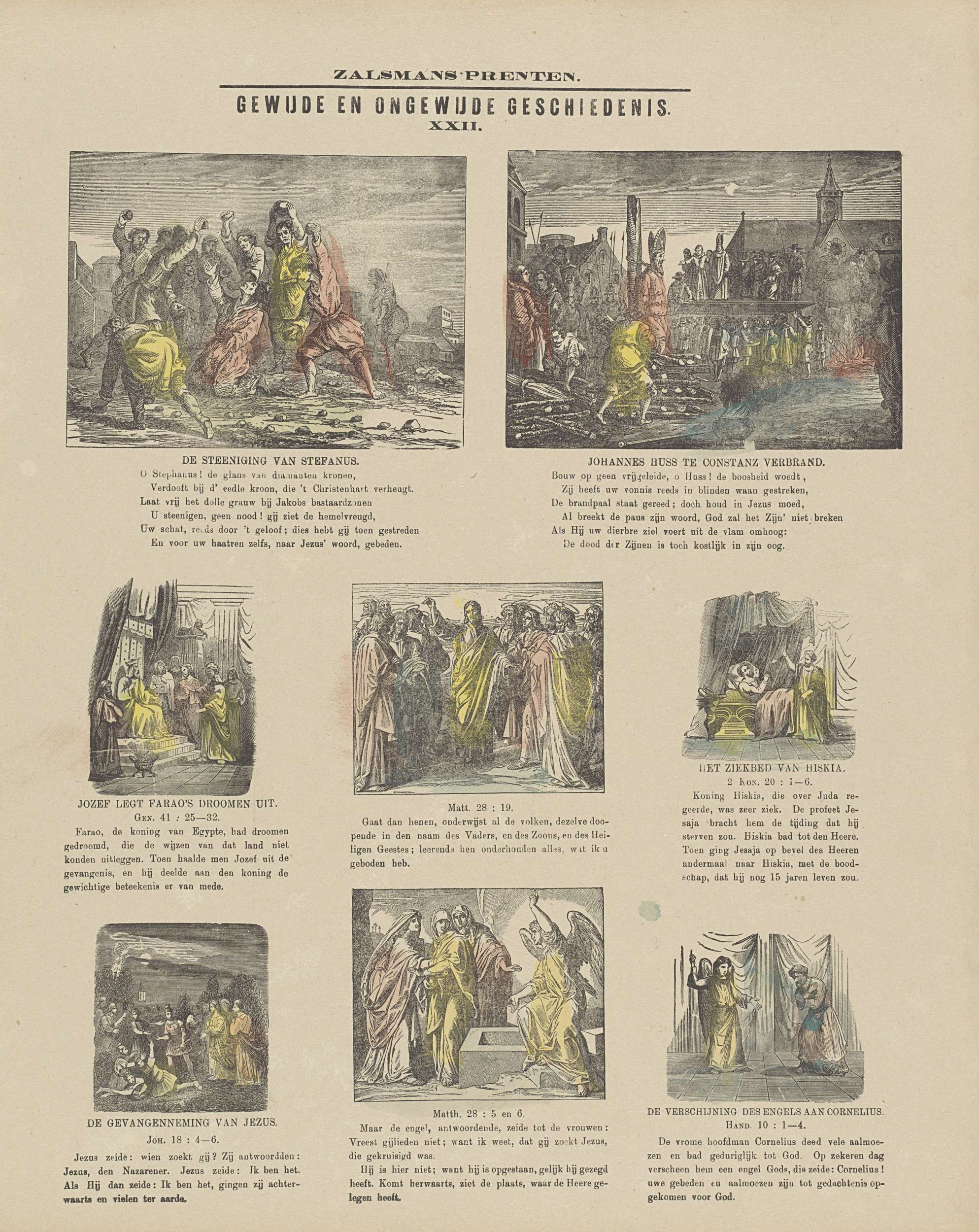 Blad met 8 voorstellingen van verhalen uit het Oude en het Nieuwe Testament. Onder elke voorstelling een onderschrift en een verwijzing naar de bijbehorende Bijbeltekst. Genummerd midden boven: XXII.