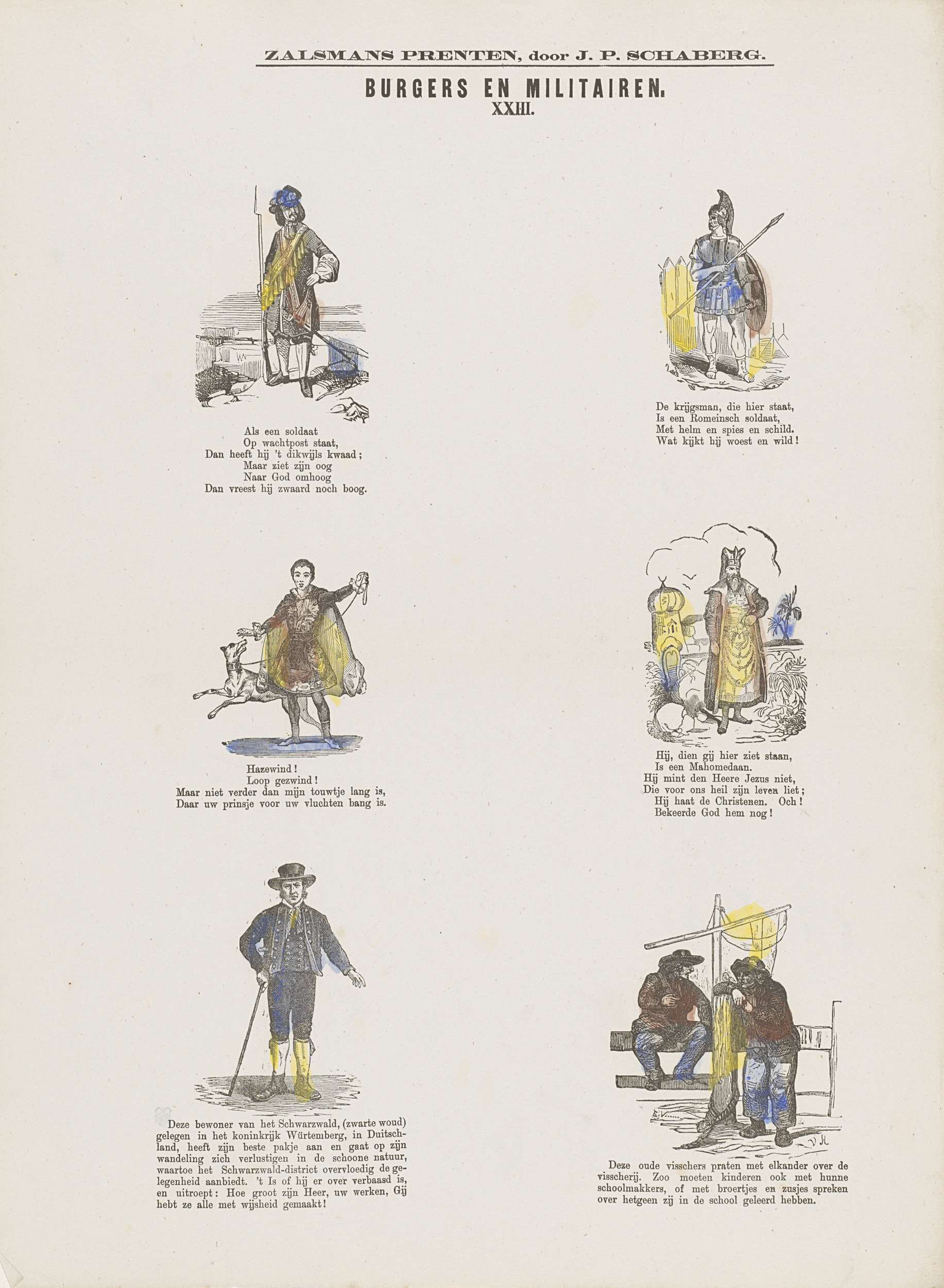 Blad met 6 voorstellingen van verschillende figuren, zoals een soldaat, een prins en een moslim. Onder elke afbeelding een onderschrift. Genummerd midden boven: XXIII.
