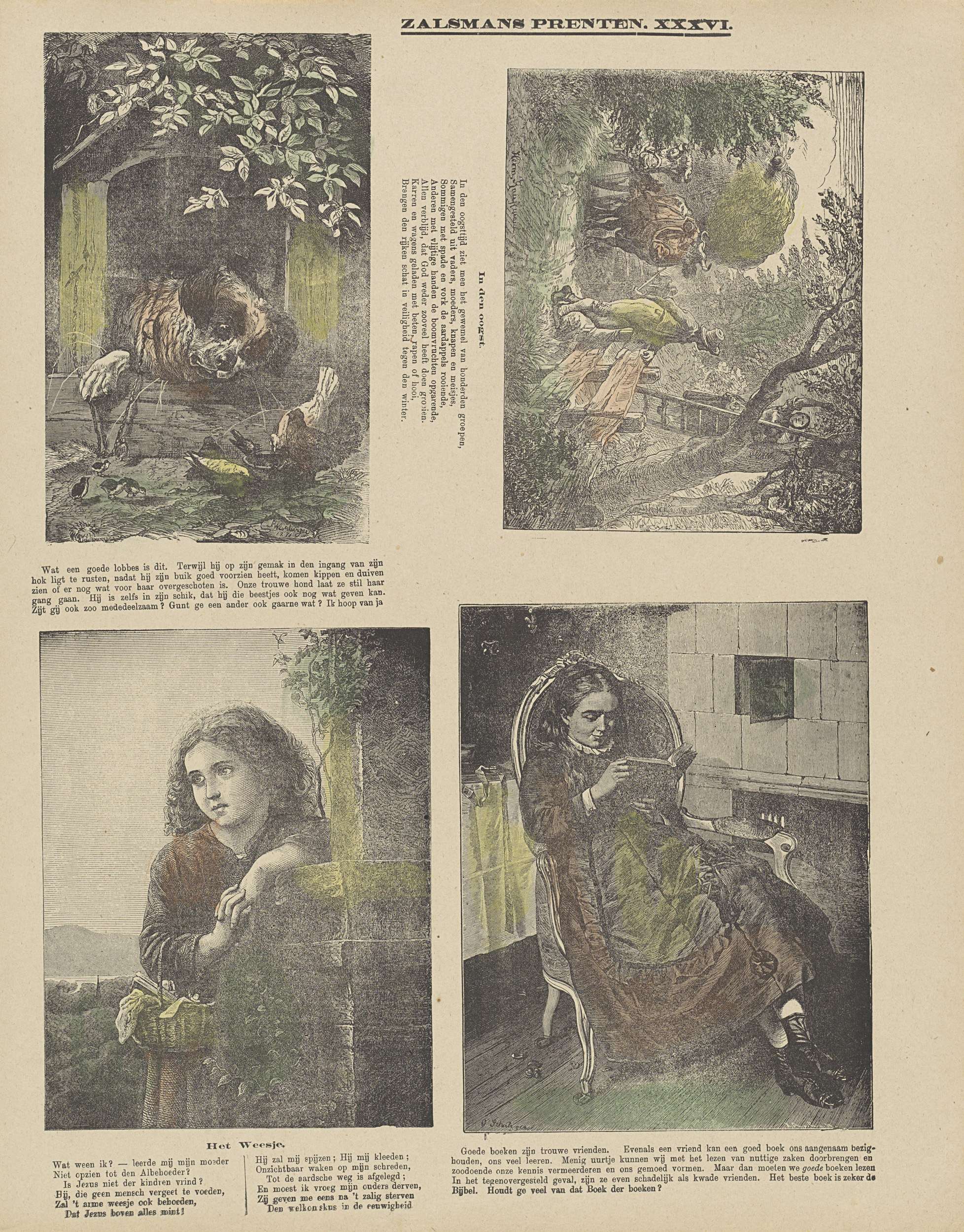 Blad met 4 voorstellingen van verschillende aard, zoals voorstellingen van een hond en van een weesmeisje. Onder of naast elke afbeelding een tekst in boekdruk. Genummerd midden boven: XXXVI.