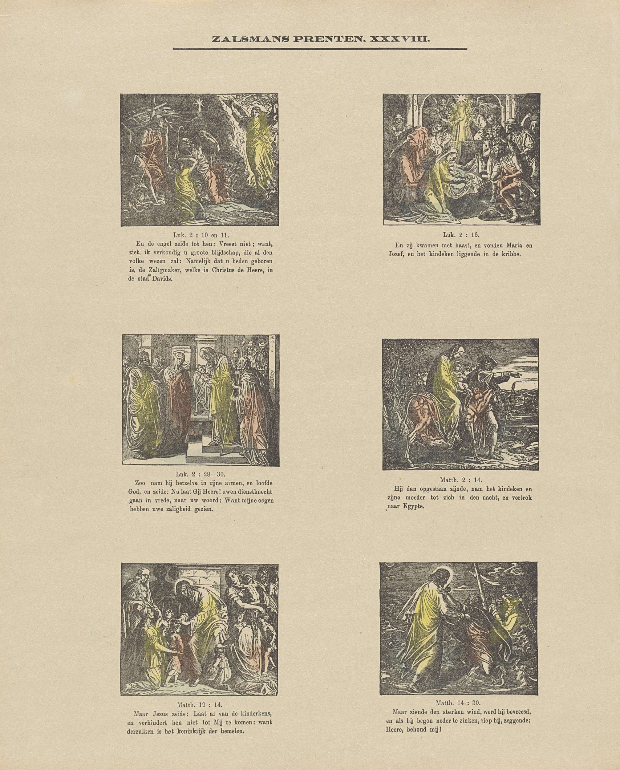 Blad met 6 voorstellingen van verhalen uit het Nieuwe Testament over het leven van Christus. Onder elke afbeelding een onderschrift en een verwijzing naar de bijbehorende Bijbeltekst. Genummerd midden boven: XXXVIII.