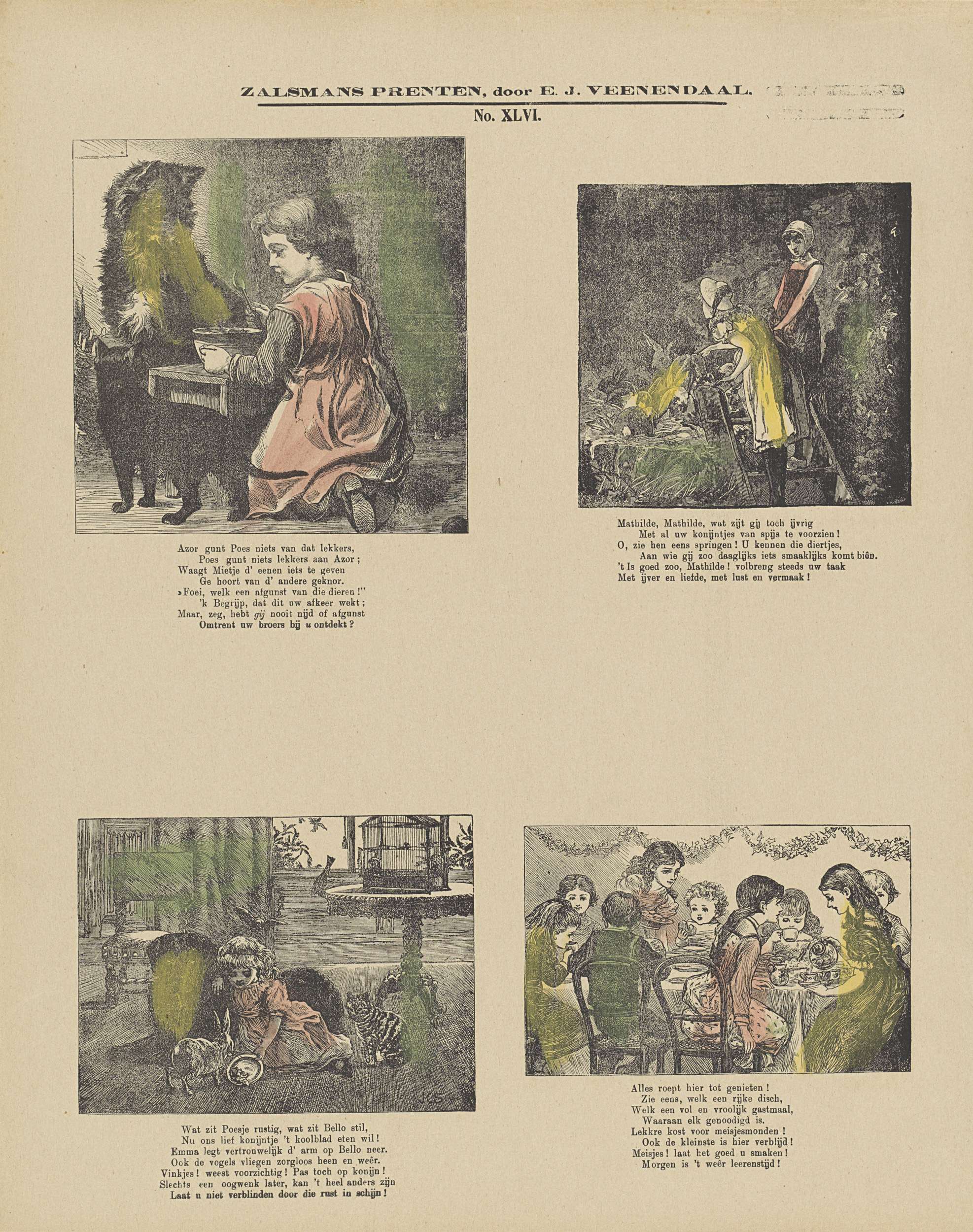 Blad met 4 kindertaferelen. Onder elke afbeelding een vers. Genummerd midden boven: XLVI.