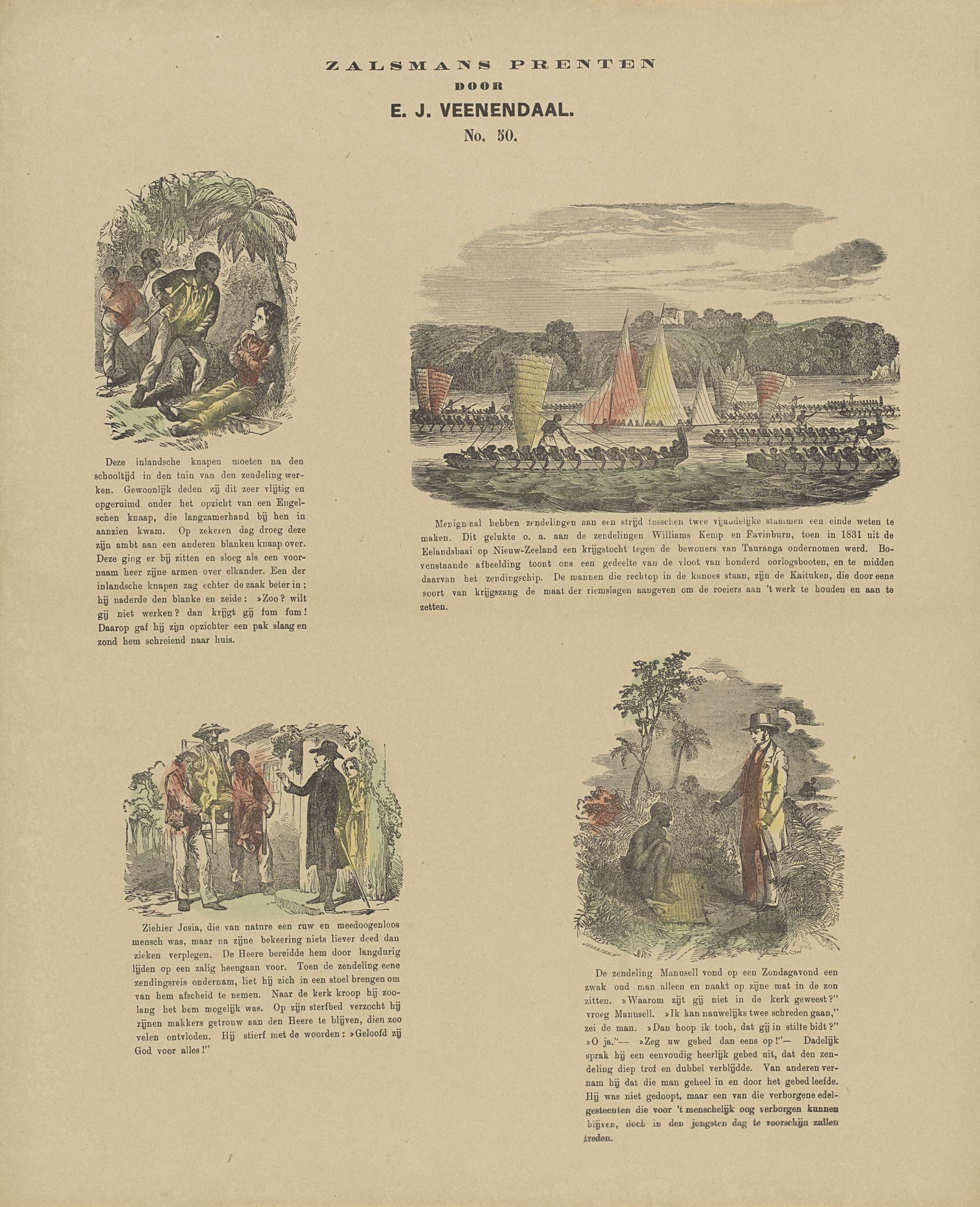 Blad met 4 voorstellingen van contact tussen Nieuw-Zeelanders en Europeanen. Onder elke afbeelding een onderschrift. Genummerd midden boven: No. 50.