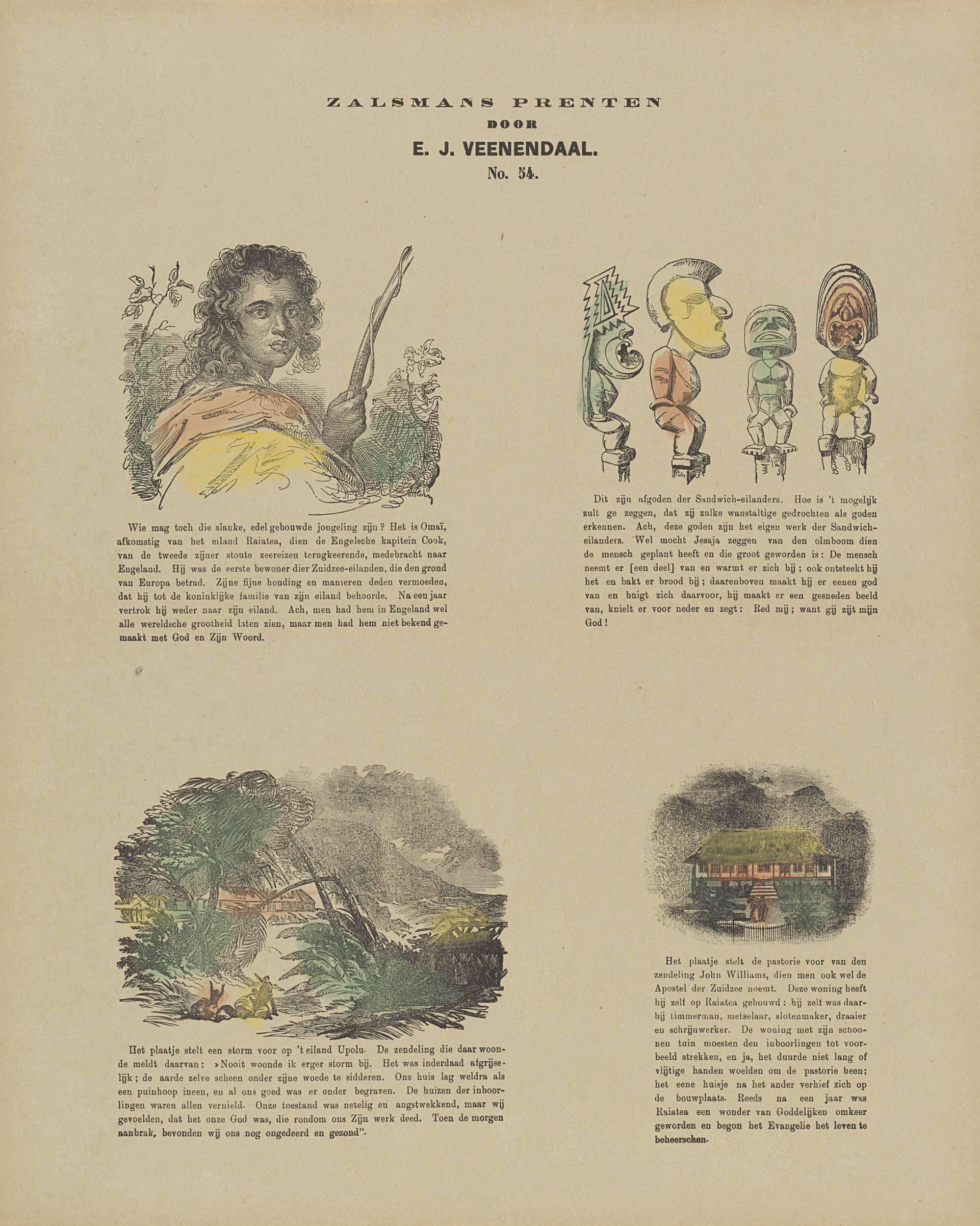 Blad met 4 voorstellingen van een bewoner, woningen en religieuze beelden van de Sandwicheilanden. Onder elke afbeelding een onderschrift. Genummerd midden boven: No. 54.