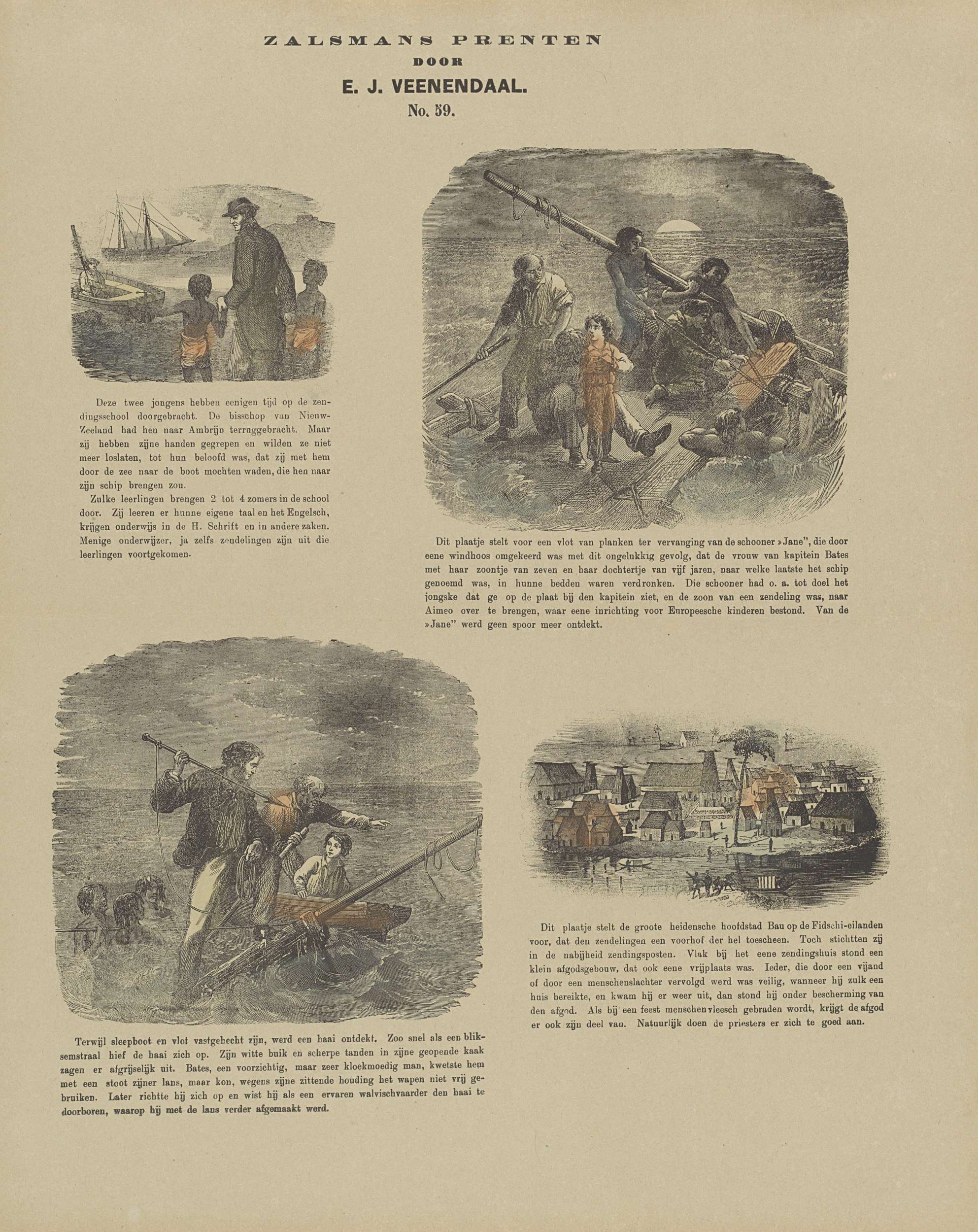 Blad met 4 voorstellingen van onder andere schipbreukelingen. Onder elke afbeelding een onderschrift. Genummerd midden boven: No. 59.