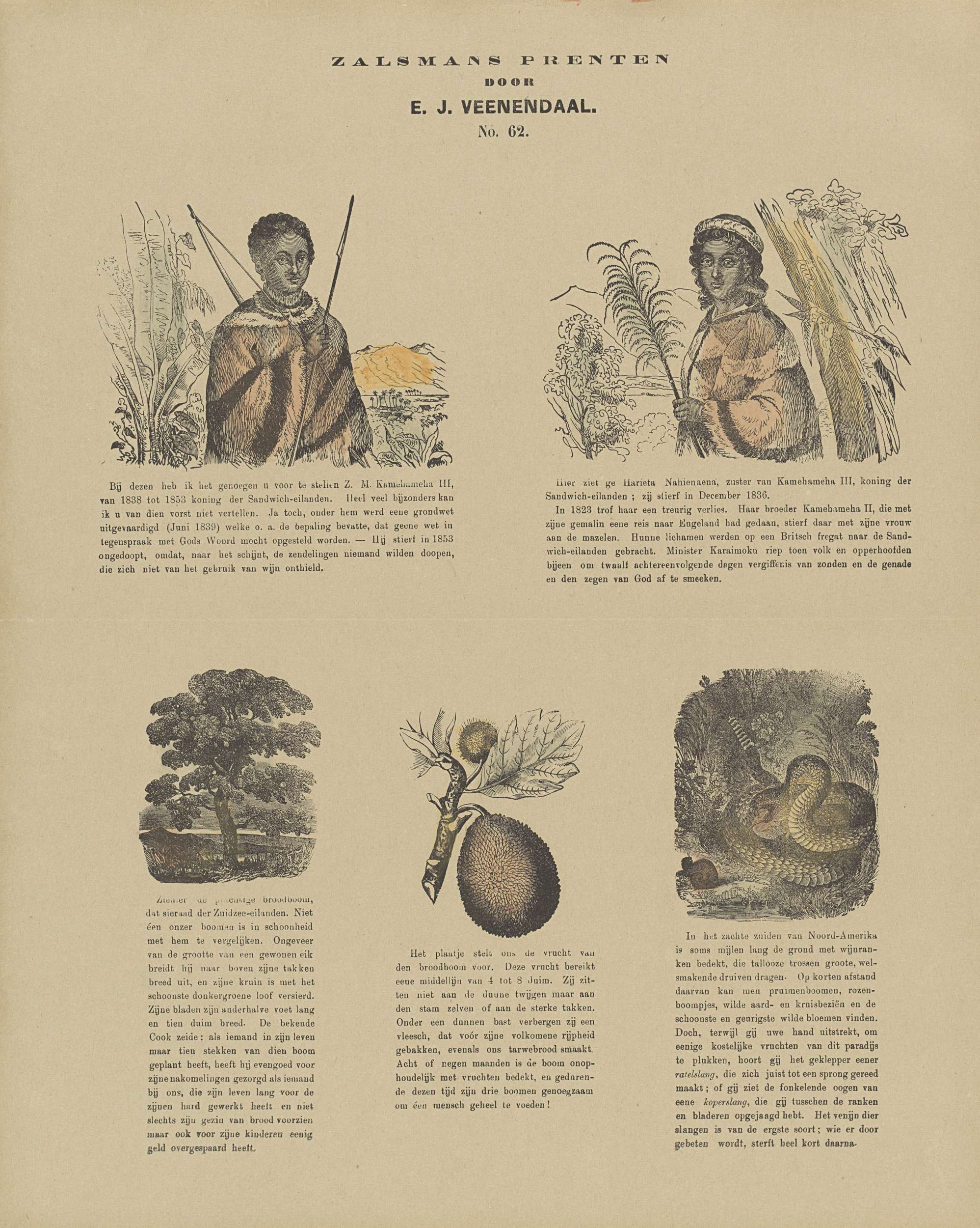 Blad met 5 voorstellingen van Kamehameha III en zijn zuster Nahiennaena, een boom, een vrucht en een slang. Onder elke afbeelding een onderschrift. Genummerd midden boven: No. 62.
