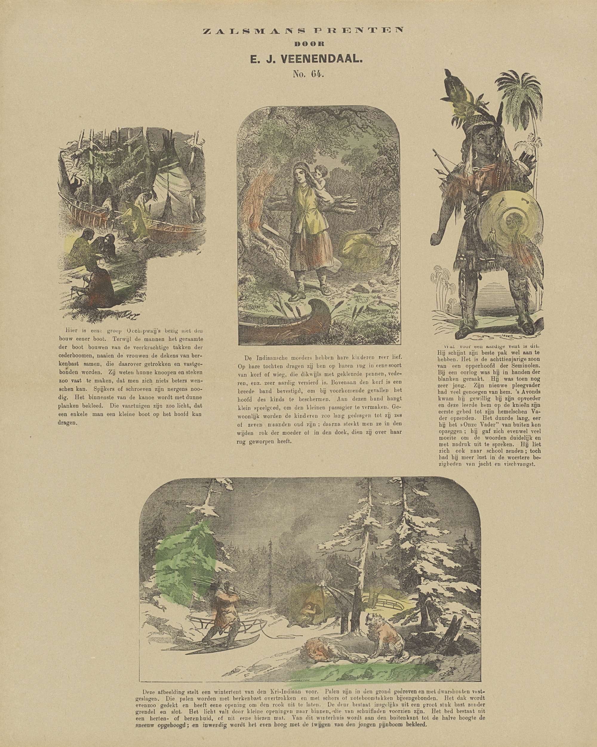 Blad met vier voorstellingen van oorspronkelijke bewoners van Noord-Amerika, waaronder Ojibwe, Seminole en Cree. Onder elke afbeelding een onderschrift. Genummerd midden boven: No. 64.