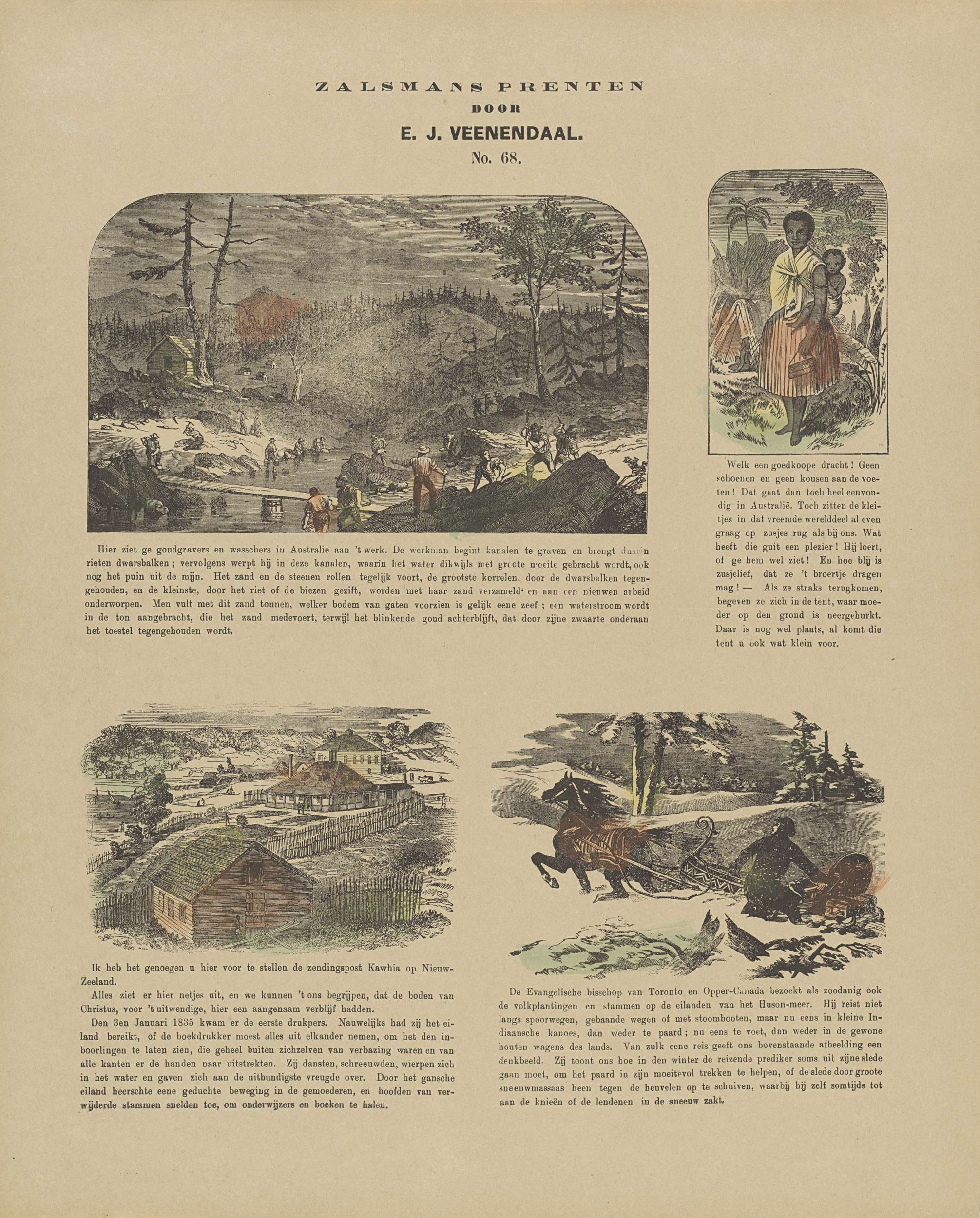 Blad met 4 voorstellingen van goudzoekers in Australië, een Australisch meisje met haar broertje, een zendingspost op Nieuw-Zeeland en een bisschop op een slee. Onder elke afbeelding een onderschrift. Genummerd midden boven: No. 68.
