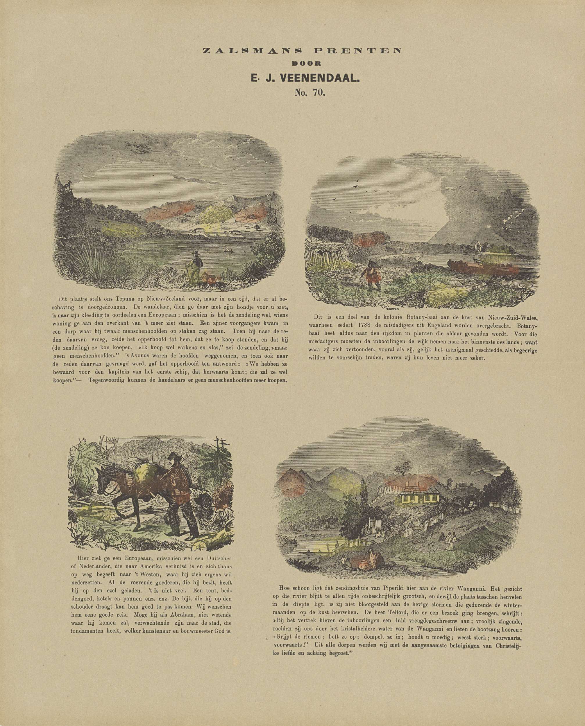 Blad met 4 voorstellingen van gezichten van Amerika, Nieuw-Zeeland en Canada. Onder elke afbeelding een onderschrift. Genummerd midden boven: No. 70.