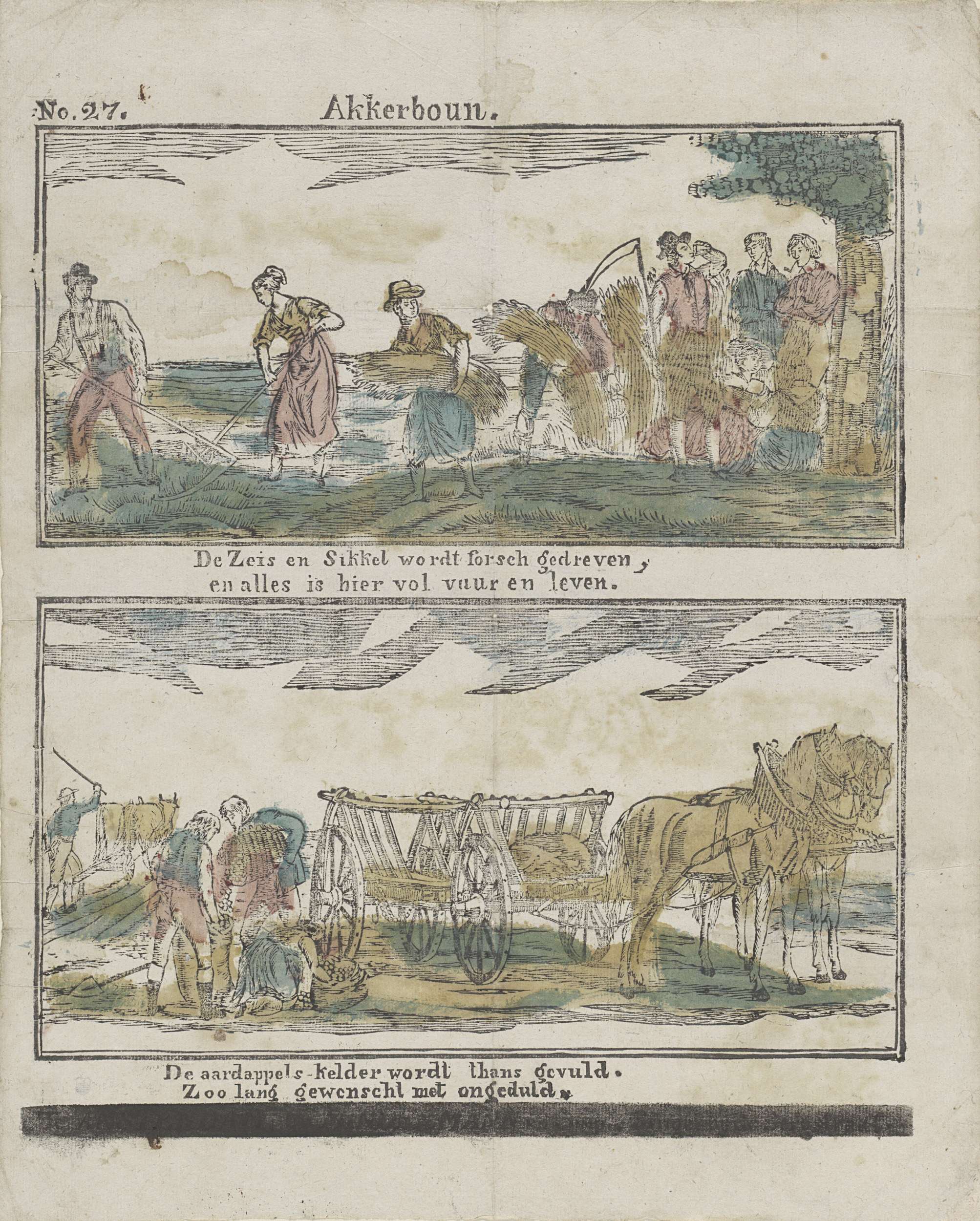 Blad met 2 voorstellingen van boeren die op het land werken. Onder elke afbeelding tekst. Genummerd linksboven: No. 27.