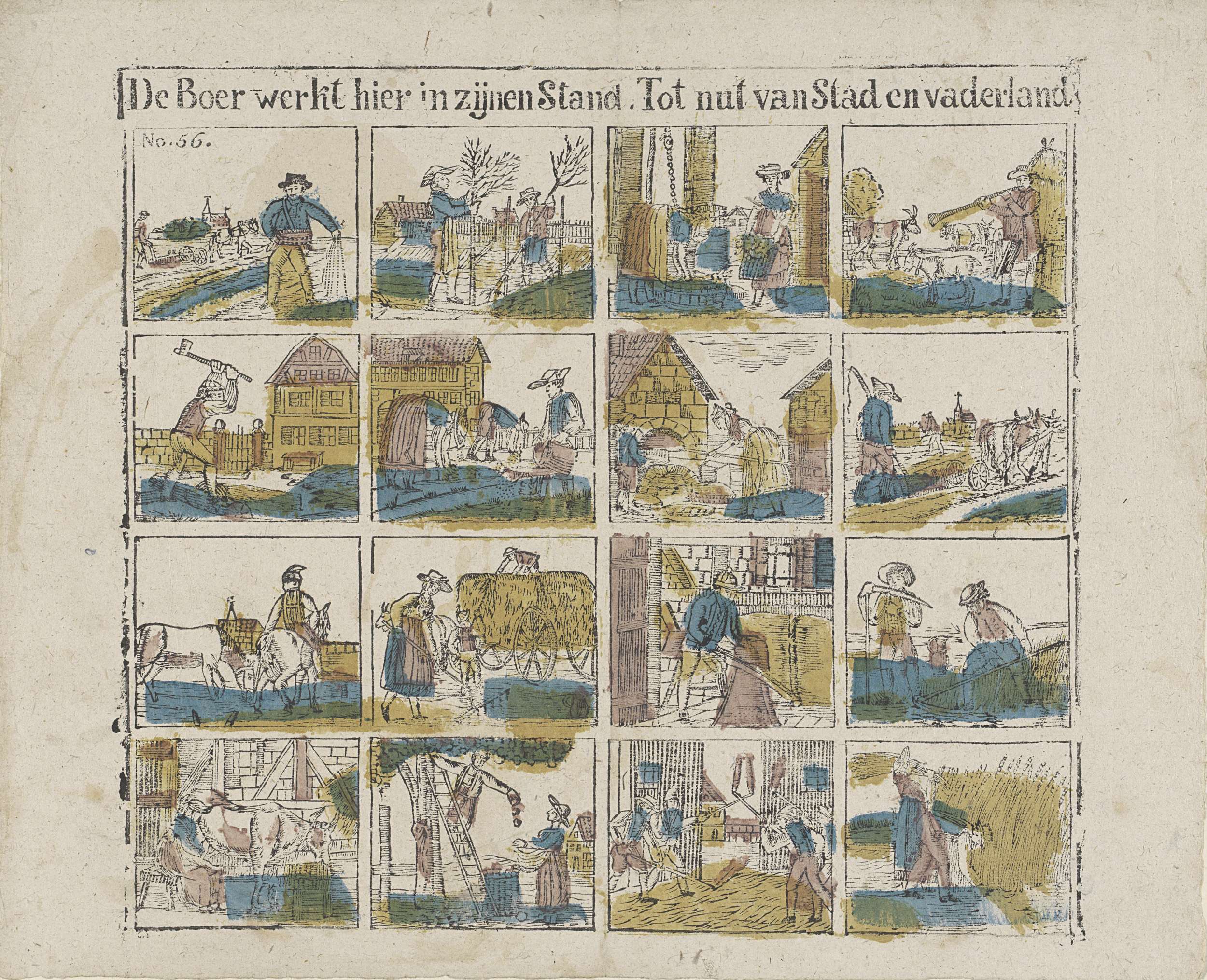 Blad met 16 voorstellingen van de verschillende werzaamheden van boeren. Genummerd linksboven: No. 56.