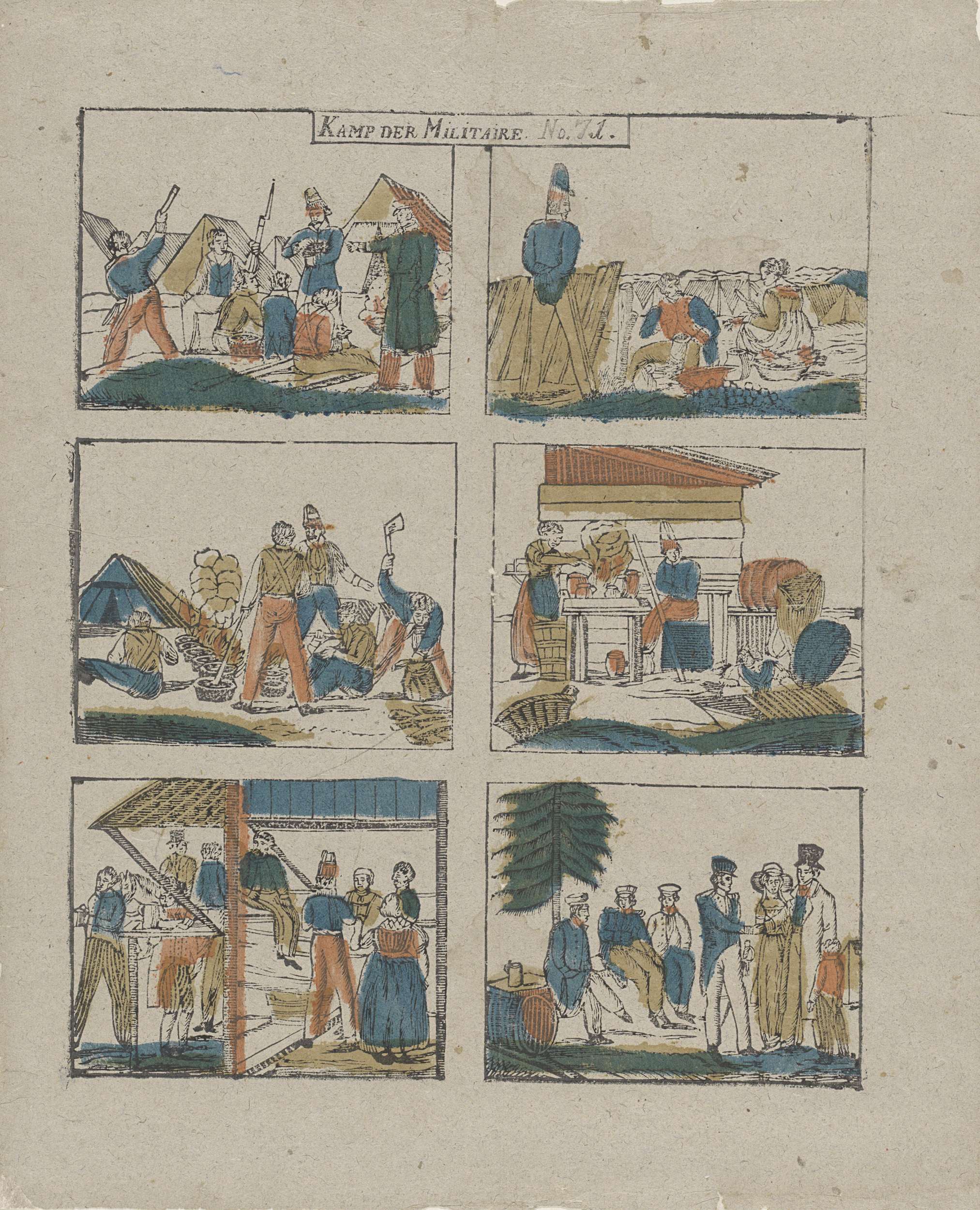 Blad met 6 voorstellingen van militairen in een kamp. Genummerd midden boven: No. 71.