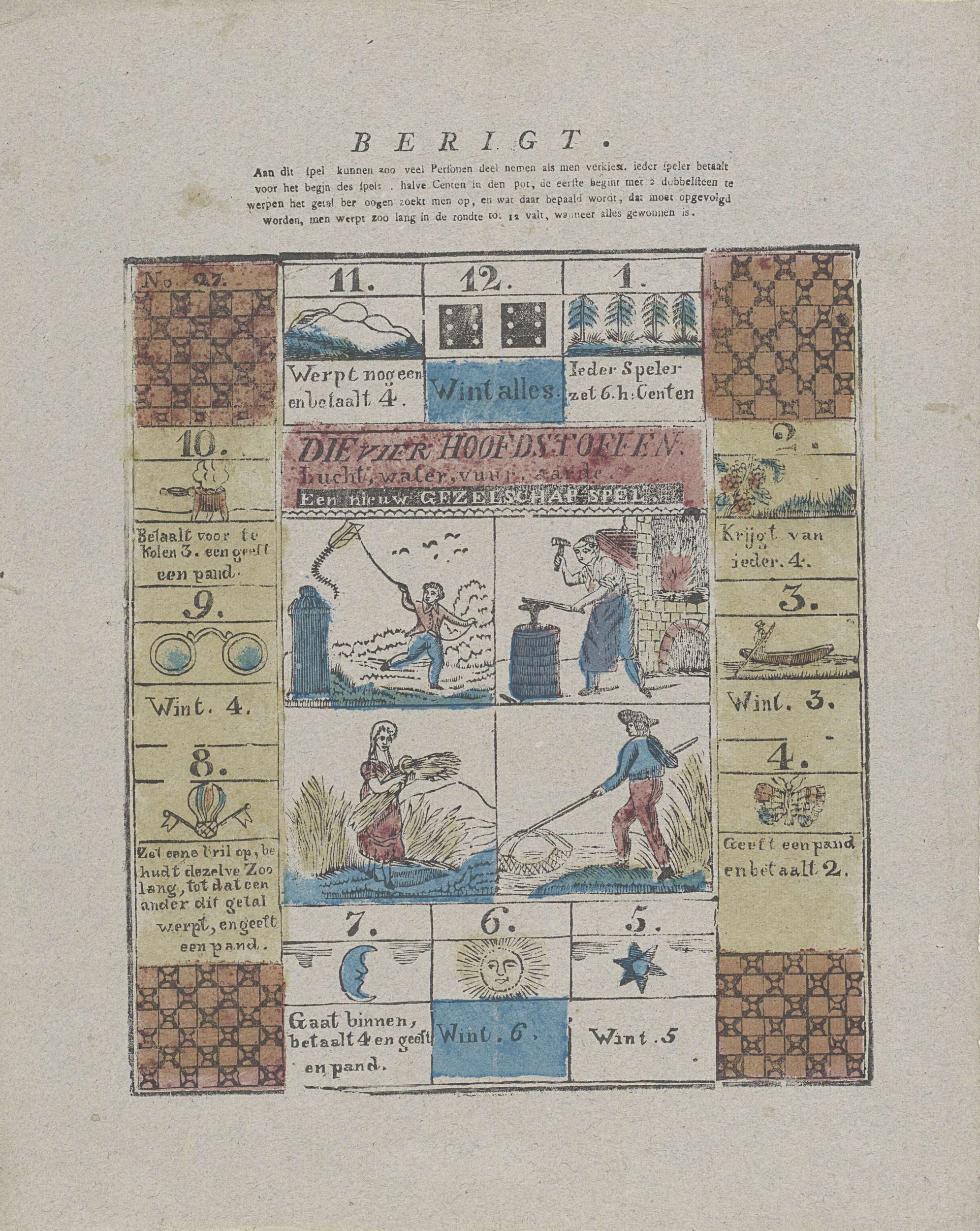 Bordspel met als thema de vier elementen. Centraal vier vakken met verbeeldingen van de vier elementen. Daaromheen twaalf genummerde vakjes met opdrachten. Midden boven de spelregels in boekdruk. Genummerd linksboven: No. 27.