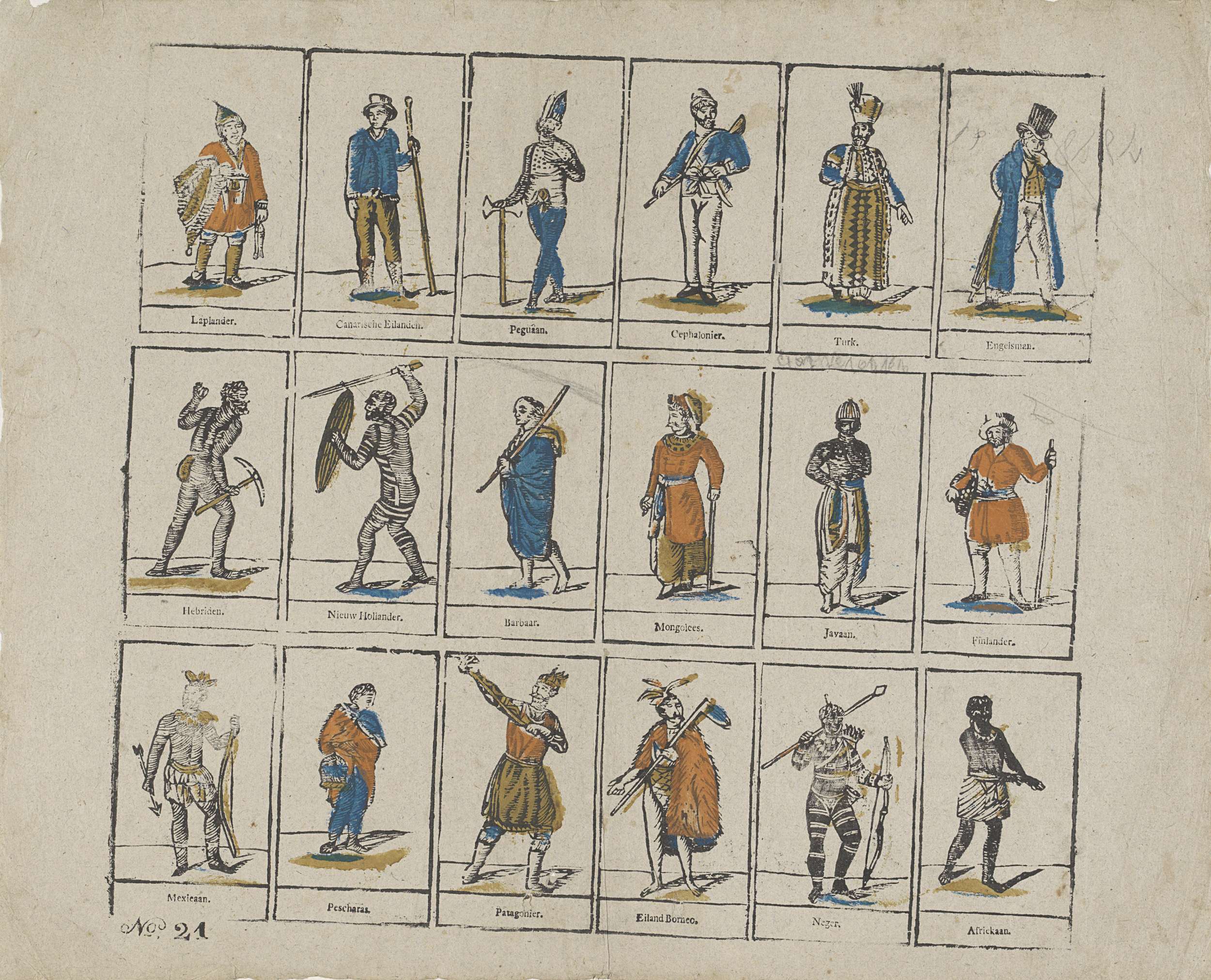 Blad met 18 voorstellingen van figuren uit vreemde volkeren. Onder elke afbeelding een onderschrift in boekdruk. Genummerd linksonder: No. 21.