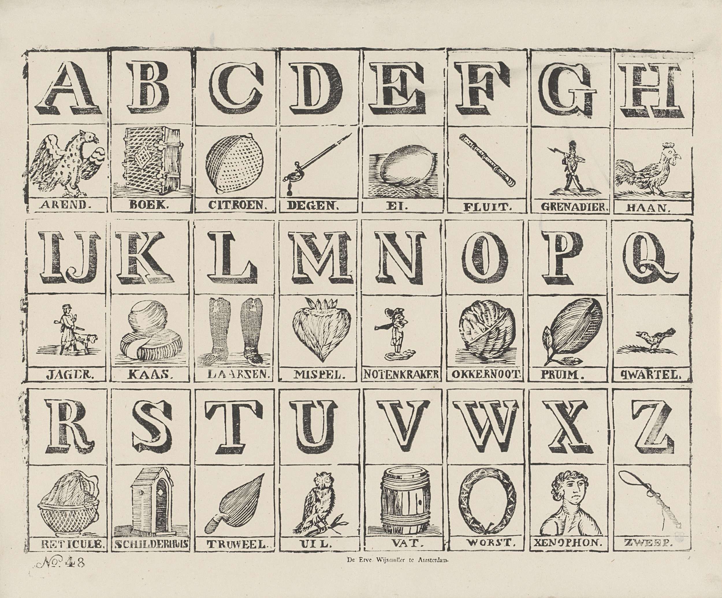 Blad met voorstellingen van de letters van het alfabet geïllustreerd met voorwerpen, dieren en figuren waarvan de woorden met de betreffende letter beginnen. Onder elke voorstelling een onderschrift. Genummerd linksonder: no. 48.