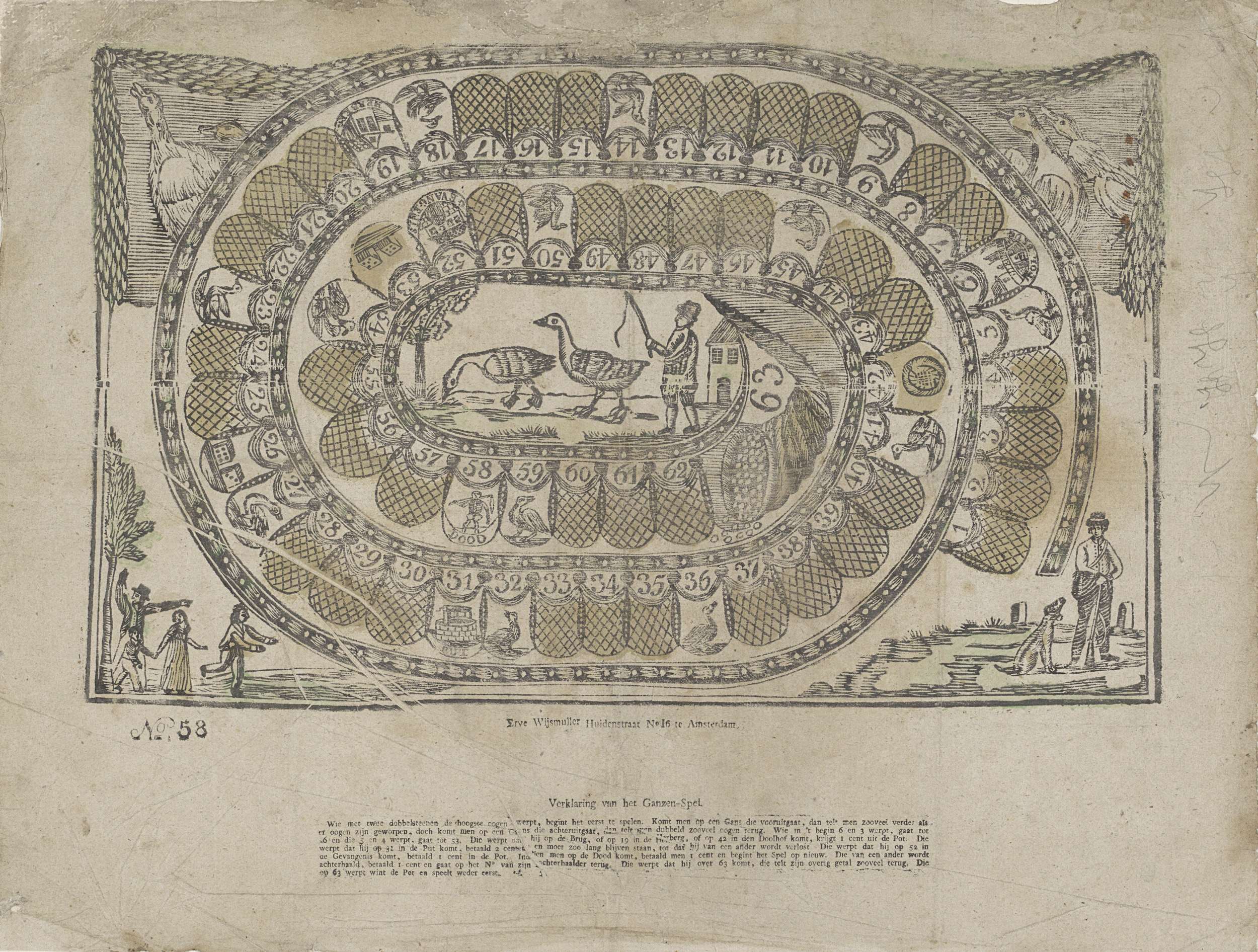 Ganzenbordspel met vakjes genummerd van 1 tot en met 63. In enkele vakjes voorstellingen van ganzen. In het grote centrale vak een voorstelling van een boer en twee ganzen. In de ondermarge de spelregels in boekdruk. Genummerd linksonder: No. 58.