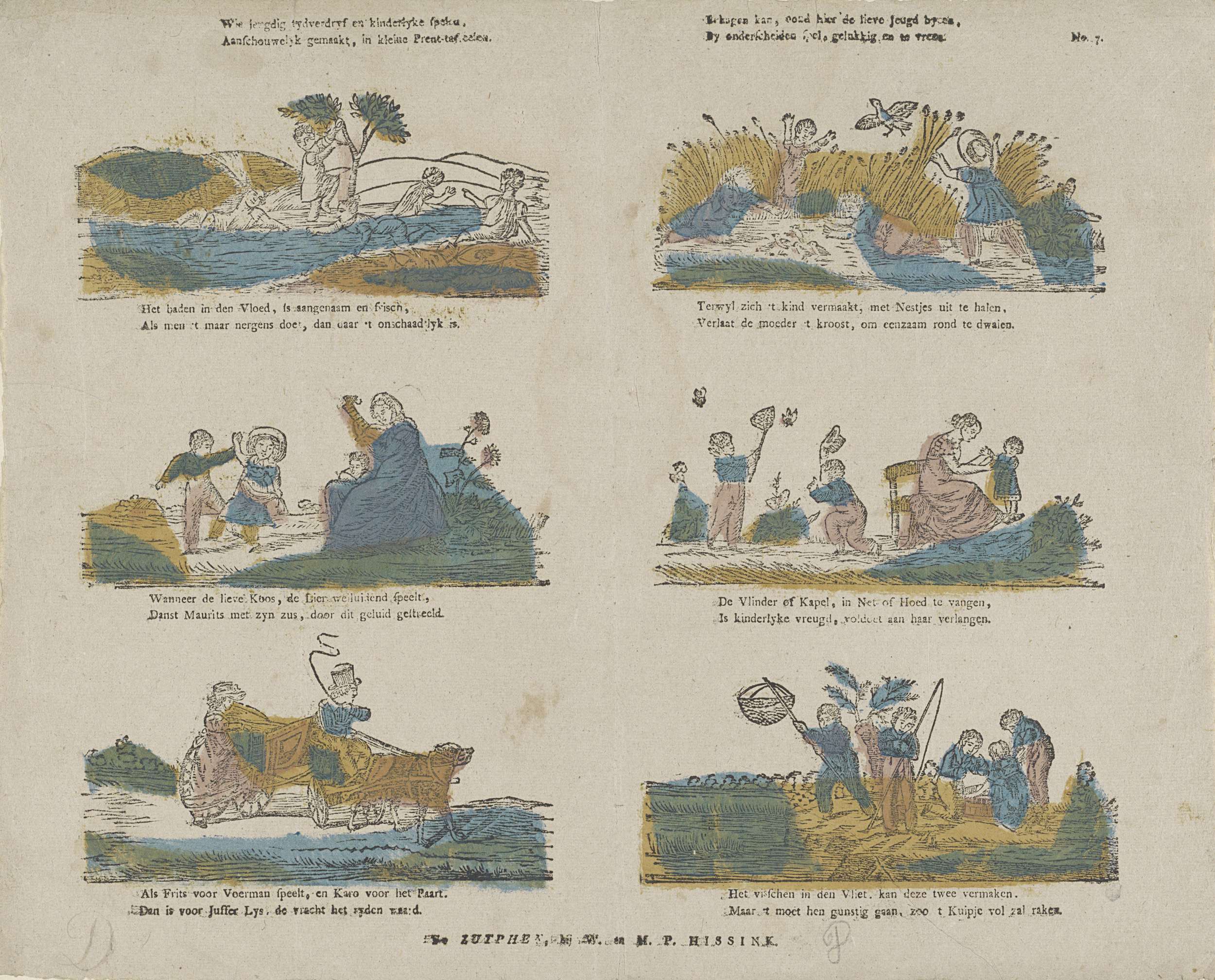 Blad met 6 voorstellingen van kinderspelen en bezigheden, zoals zwemmen en vissen. Onder elke afbeelding een tweeregelig vers. Genummerd rechtsboven: No. 7.