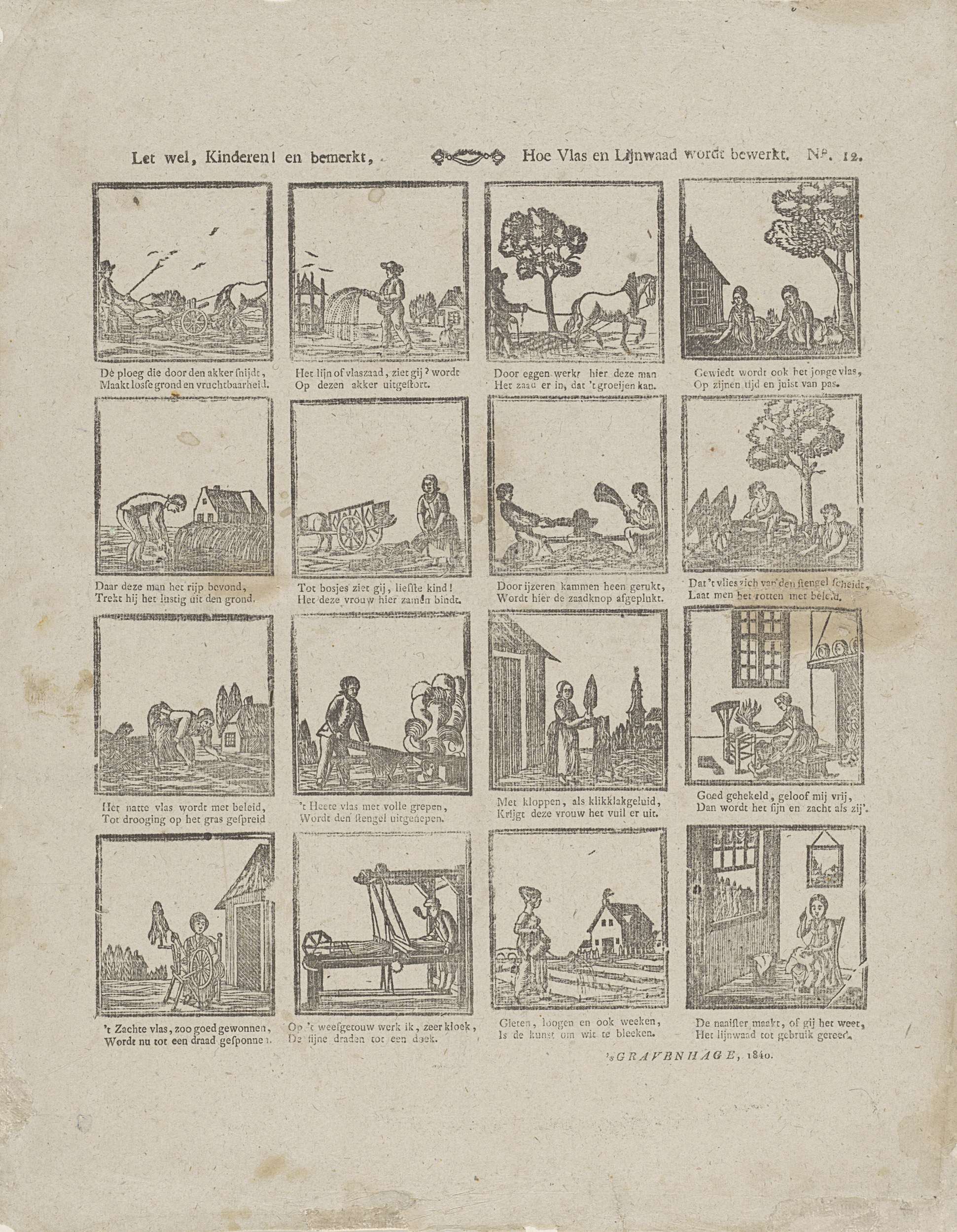 Blad met 12 voorstellingen over het bewerken van vlas en linnen. Onder elke afbeelding een tweeregelig vers. Genummerd rechtsboven: No. 12.
