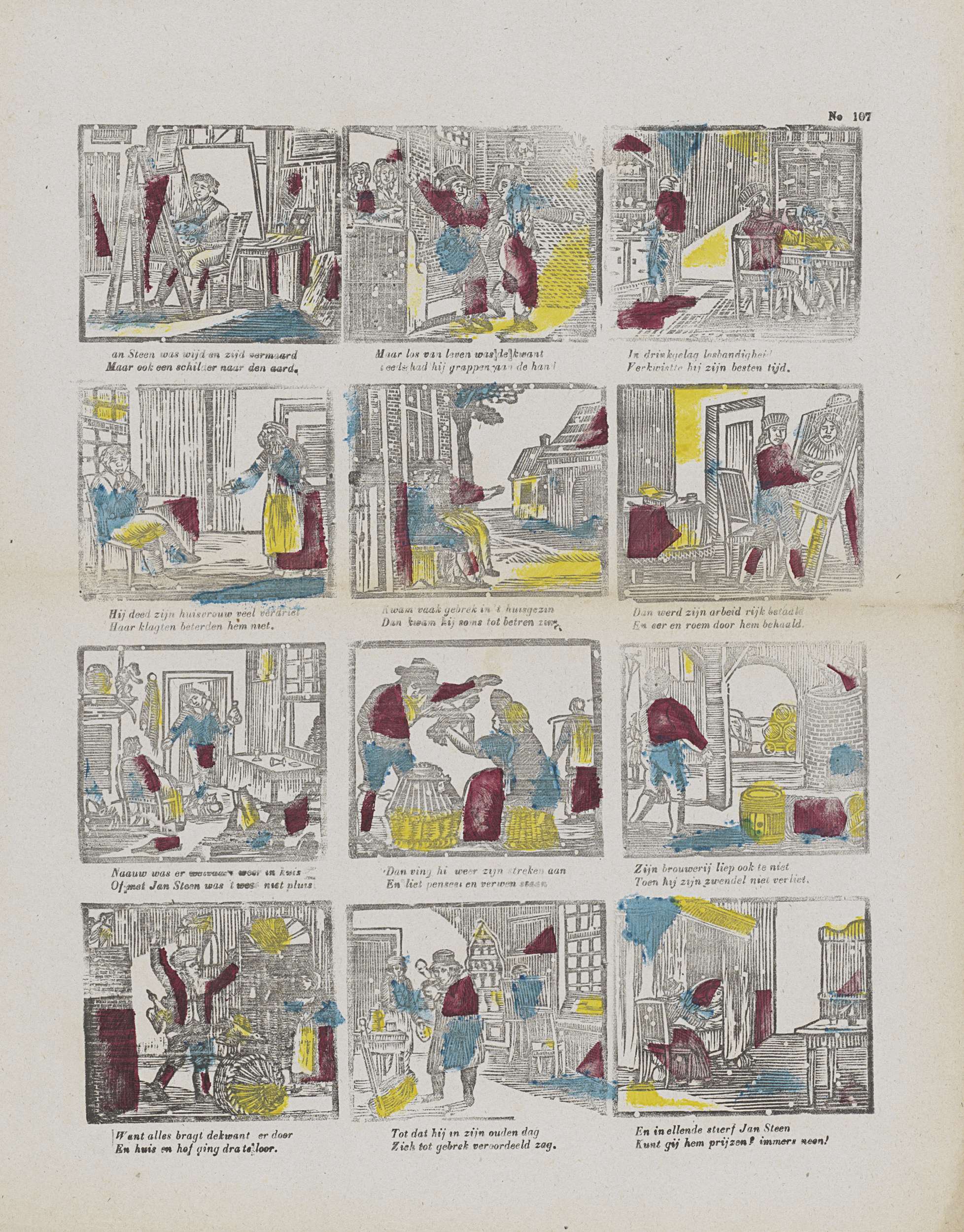 Blad met 12 voorstellingen over het huishouden van Jan Steen. Jan schildert, heeft een brouwerij, koopt eenden en sterft. Onder elke voorstelling een tweeregelig vers. Genummerd rechtsboven: No 107.
